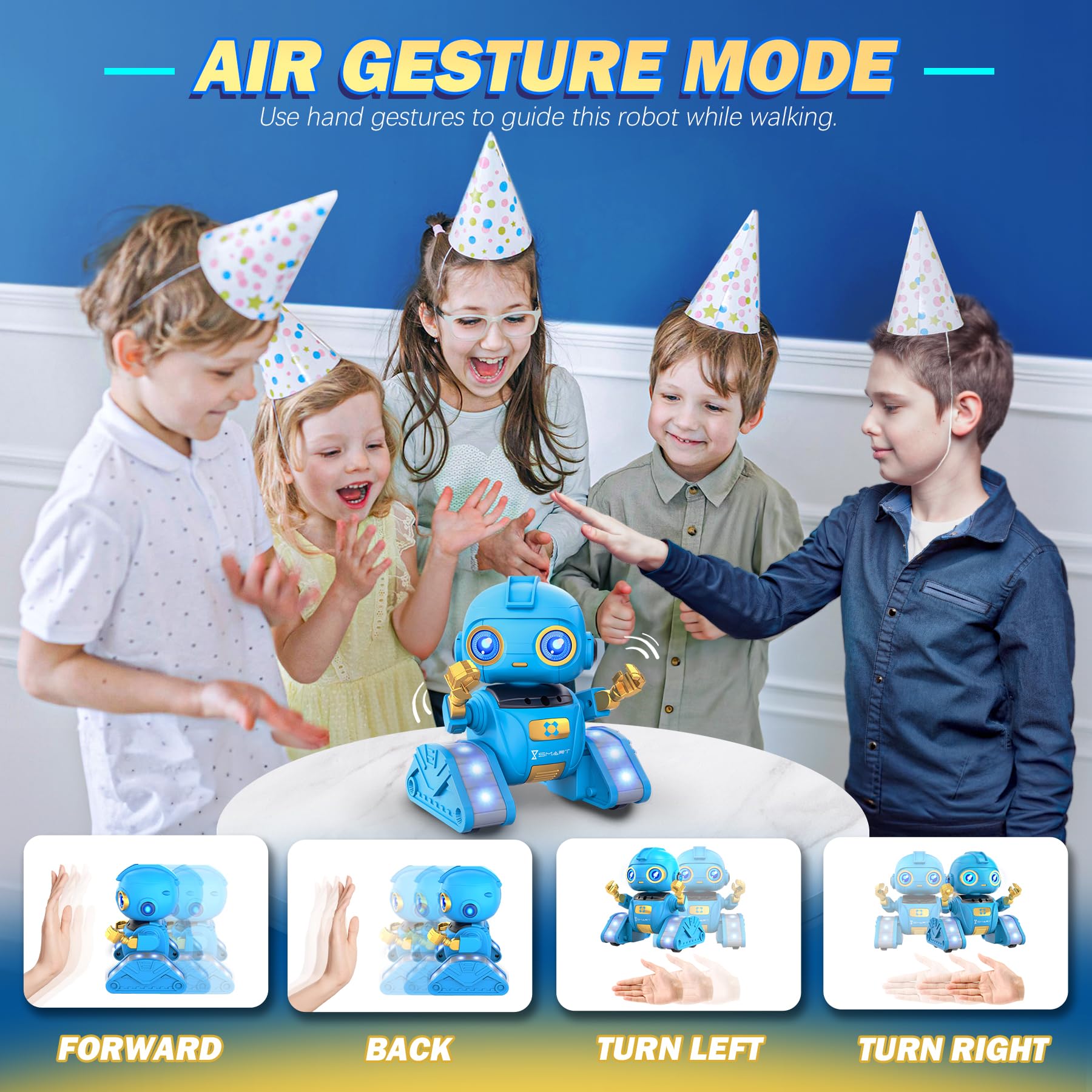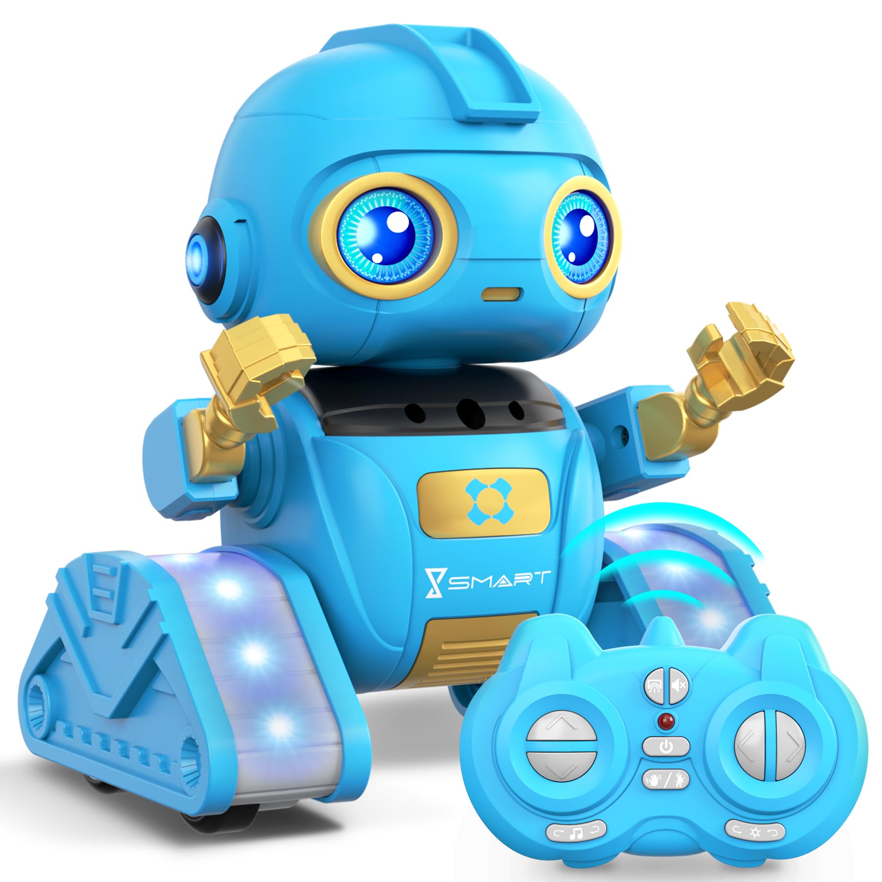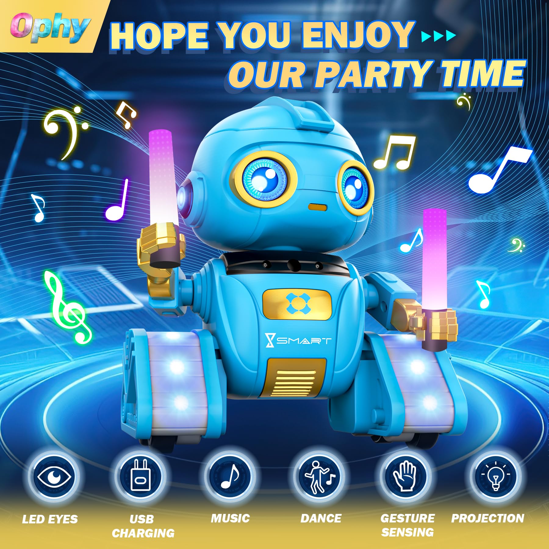 ["Innovative Projection Function"] What sets the Ophy Robot apart from other robots is its unique head projection function. This innovative technology allows the robot to project beautiful lights and patterns from its head, creating a stunning visual experience for children.["Caution! Fully charge the device before first use or after a long period of inactivity. Only charge with the included charging cable. Do not use any other charging cable. Turn off the device during charging. Red light will illuminate while charging."]["Multifunctional Design"] Equipped with LED eyes, the controller can switch between different LED eye colors; it can sing and dance to a variety of songs. Powerful LED tank tracks allow it to move flexibly in any direction - forward, backward, left, and right. In automatic demonstration mode, it performs 360-degree rotations and dances with agile arms and heads. Gesture recognition and interference-free 2.4GHz controller enhance interactive fun for children.["High Quality and Safety"] Our Ophy Robot is made of high-quality ABS plastic, which is not only durable and shockproof, but also environmentally friendly and recyclable. This sustainable choice helps protect the environment and provides children with hours of fun.["Rechargeable Design"] The Ophy Robot comes with a rechargeable battery, making operation easy and environmentally friendly. Simply use the included USB charging cable to easily recharge the robot, providing hours of fun for your children. Offers a valuable alternative to screen time.["Emphasis on Education and Entertainment"] The Ophy Robot not only entertains children but also stimulates their imagination and creativity. Through interacting with the robot, children can learn about technology, develop practical skills and logical thinking, making it an ideal companion for their future life.["Great and Cool Gifts"] This cool projection robot is suitable for boys and girls aged 6, 7, 8, 9, 10, 11, and 12 years old, making it an ideal birthday gift for children. The projection robot features a variety of functions that inspire children's creativity and is perfect for daily play, picnics, camping, and other indoor and outdoor activities. The Ophy Projection Robot comes in an exquisite gift box, making it an excellent choice for gifts and perfect for Children's Day, Christmas, and Halloween. Surprise your child with the projection robot as a birthday gift.