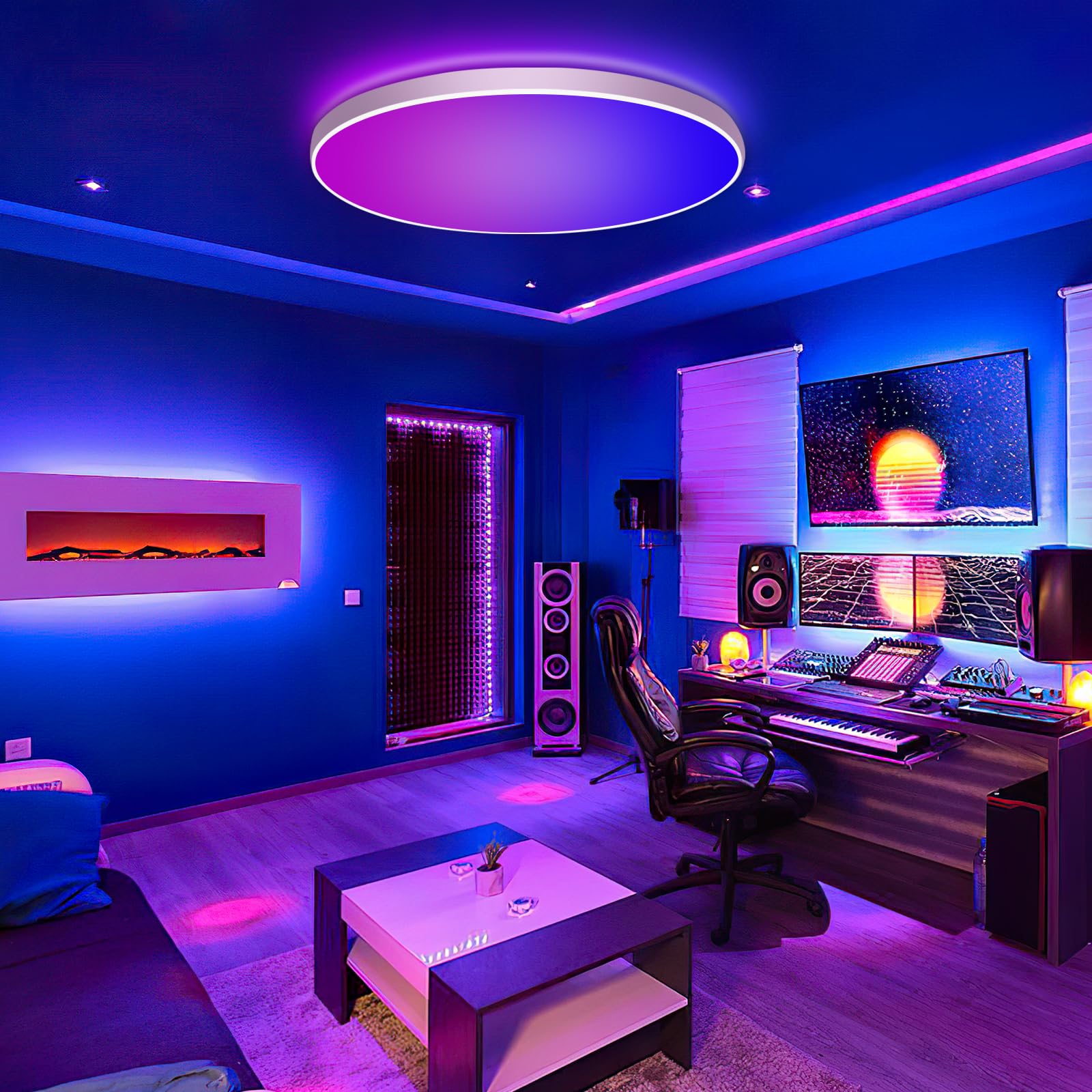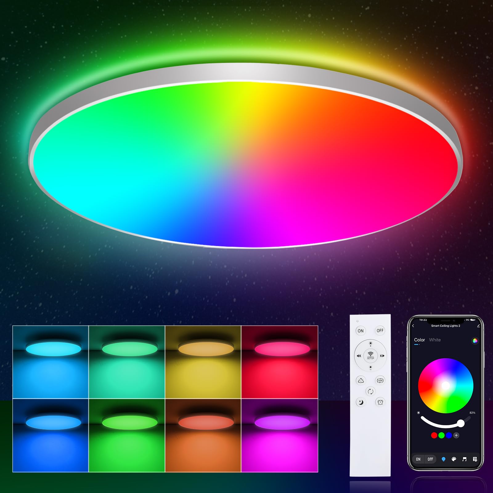 "💡【Switch at Will】Smart LED ceiling lighting offers 16 million alternative RGB colors, allowing you to choose any mood. The dimmable room ceiling lights can adjust the color temperature from warm white to cool white, and the adjustable brightness range is 1%-100%. Highly recommended for smaller to medium-sized rooms when looking for uniform and bright lighting that can be adjusted to your preferences. Create an attractive and atmospheric atmosphere in your home."