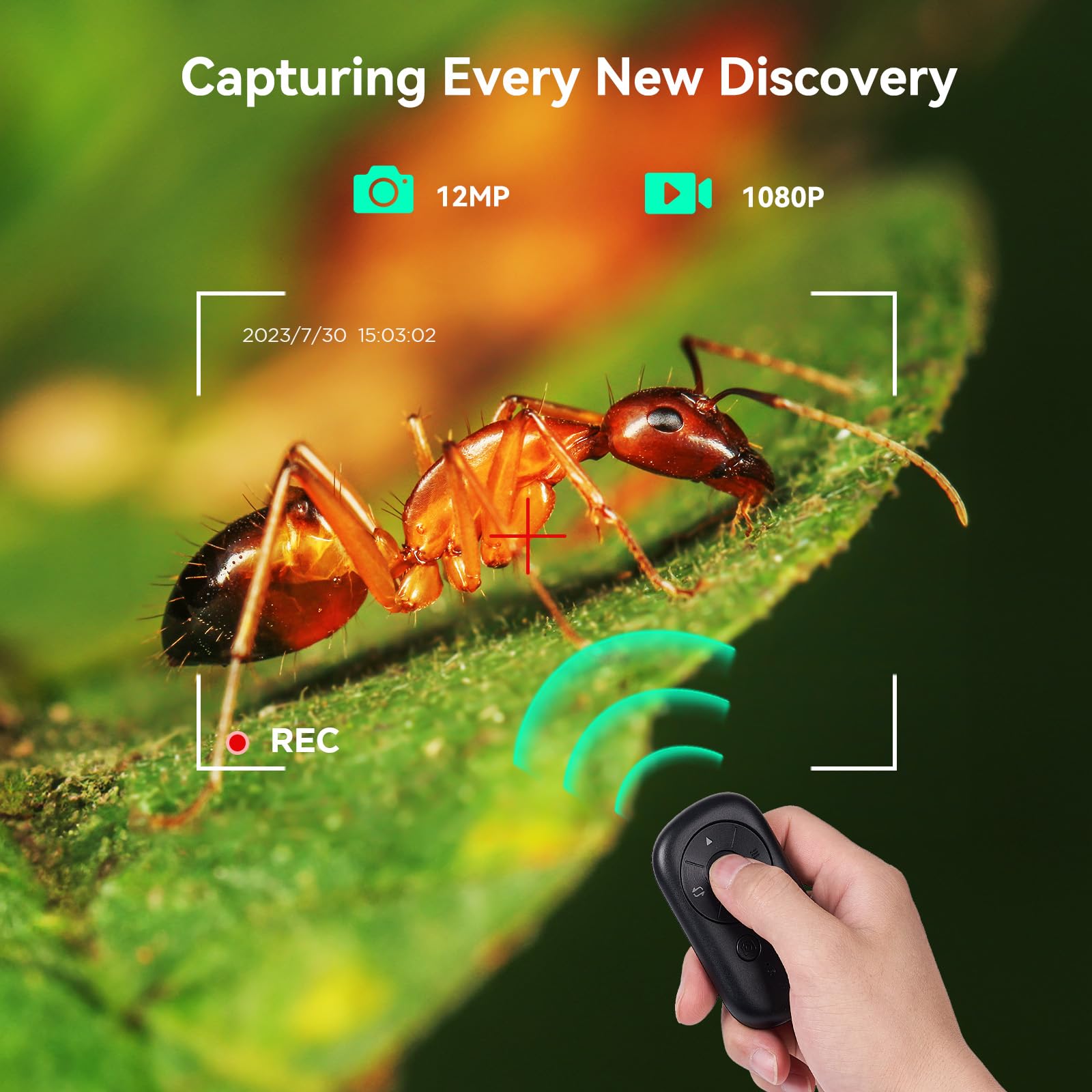 "Documentation: The microscope also functions as a camera, capturing 12 MP photos and 1080P videos without delay; It includes an SD card and a remote control for easy navigation and precise image capture"