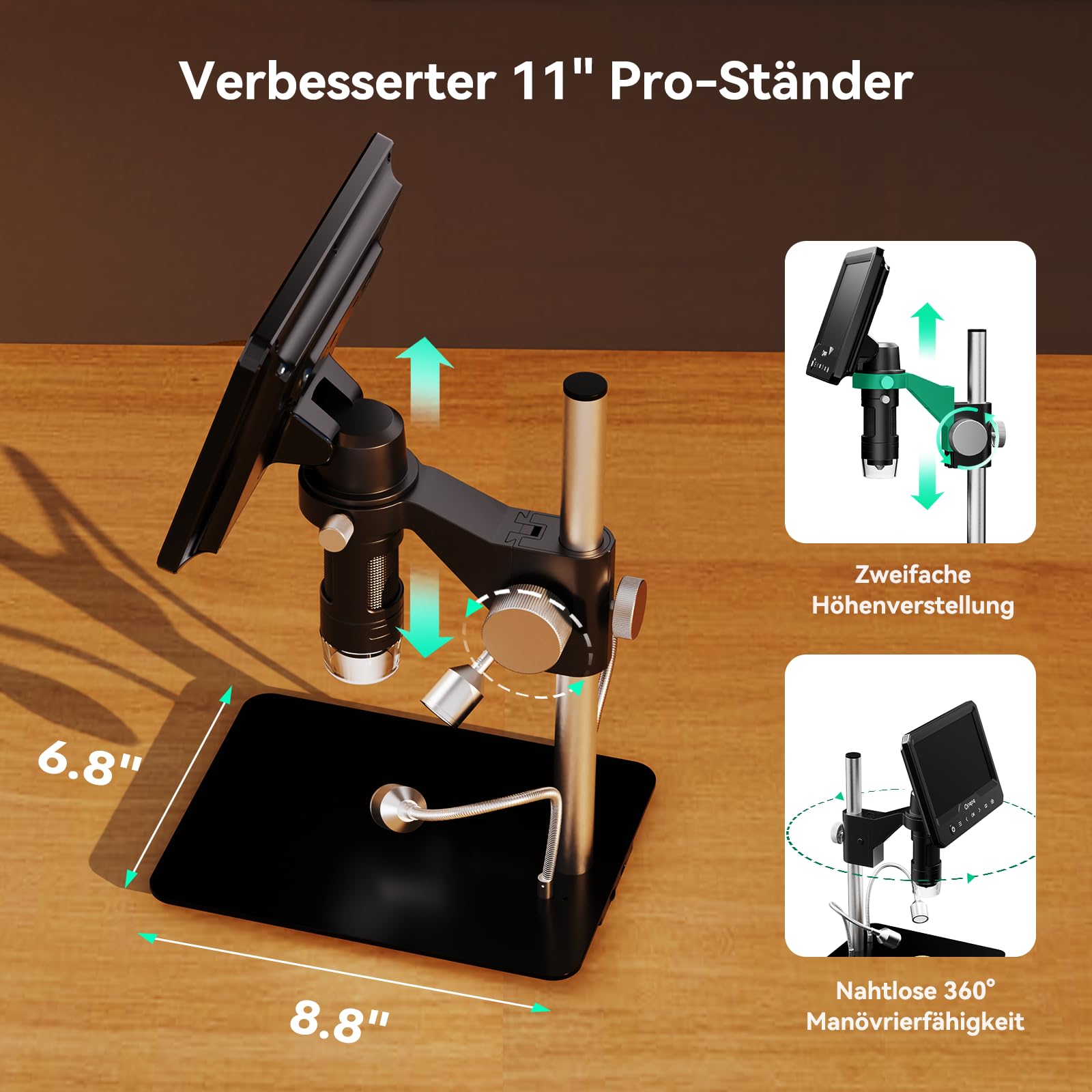 "11-inch Pro Stand: The improved stand provides plenty of space and high zoom capabilities for inspecting small components and circuit board traces; The sturdy all-metal base ensures stability, perfect for using soldering tools"
