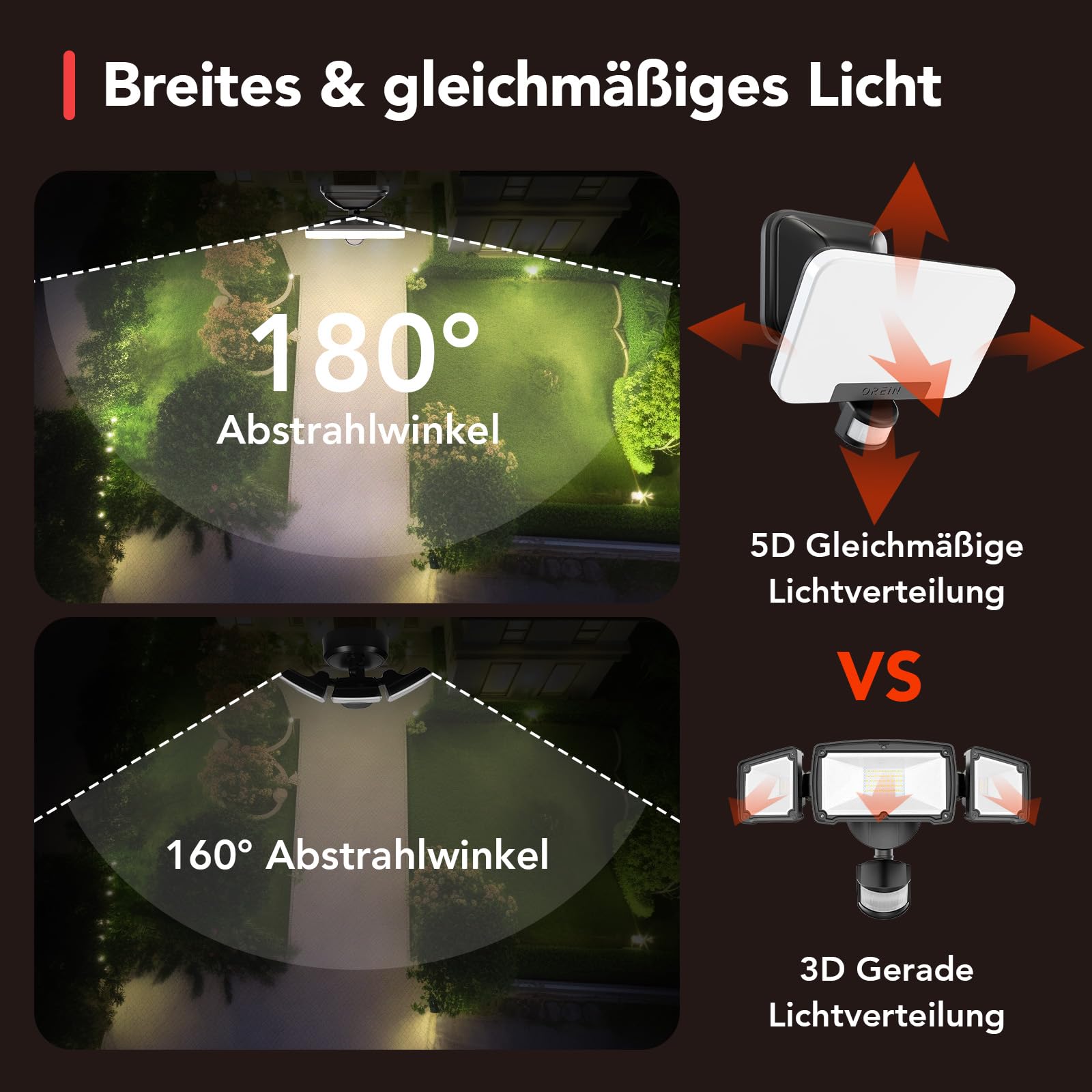 【CCT 3 Colors for More Scenes】Unlike the usual cold floodlights, OREiN outdoor lamp is available in 3 color temperatures (2700K/4000K/6500K). 2700K Warm light illuminates your garden and creates a cozy atmosphere; 4000K Neutral white is ideal for additional evening lighting in garages/on patios, and 6500K Cool white light is suitable as an outdoor spotlight to immediately warn approaching strangers.
