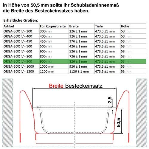 "ORGA-BOX IV UNIVERSAL / Surface: non-slip / silver-grey" "easy to clean / suitable for almost all kitchens in depth" "Depth: 18.66 inches (For drawer depth of 19.68 inches) / Height: 2.08 inches / Material thickness: 0.098 inches" "Width: 32.51 inches (for cabinet width of 35.43 inches)" "Material: Plastic Polystyrene - food-safe and meets all requirements of modern kitchens"