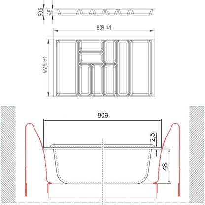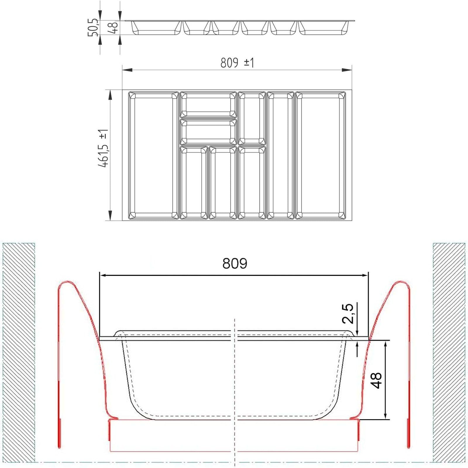 "The inner dimension of the drawer must have a width of 809 ± 1 mm at a height of 48 mm! The drawer must have a depth of 461 ± 1 mm (inner dimension). (PLEASE ALWAYS MEASURE THE INNER DIMENSION OF YOUR DRAWER BEFORE ORDERING!)