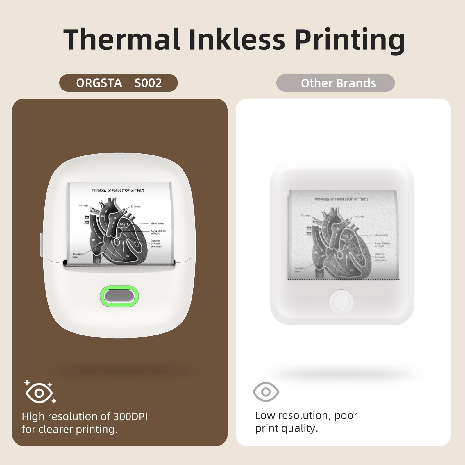 ["300 DPI for precise print quality —— 300 dpi ensure sharp texts and lines. Ideal for high-resolution photos, retail receipts, price tags, order tickets, temporary signage, sample labels, and luggage tags.","Fast printing & wide label compatibility —— With a 20 mm/s printing speed and compatibility for 20-57 mm wide labels. The ORGSTA S002 is suitable for efficient work in retail, home organization, or schools – without ink or toner.","Extensive design options in the app —— 190+ templates and 300+ symbols for personalized labels. Print texts, tables, barcodes, QR codes, timestamps, handwriting, or text recognition directly from the app.","Portable & Bluetooth compatible —— The ORGSTA S002 Mini Thermal Printer (10 cm x 9 cm x 5 cm) is iOS/Android compatible and perfect for mobile use in warehouses, schools, pop-up stores, or traveling.","High-quality printing technology & certifications —— High-speed chip and precise print head for seamless quality. Note: Monochrome printing – colored designs require colored label tapes."]