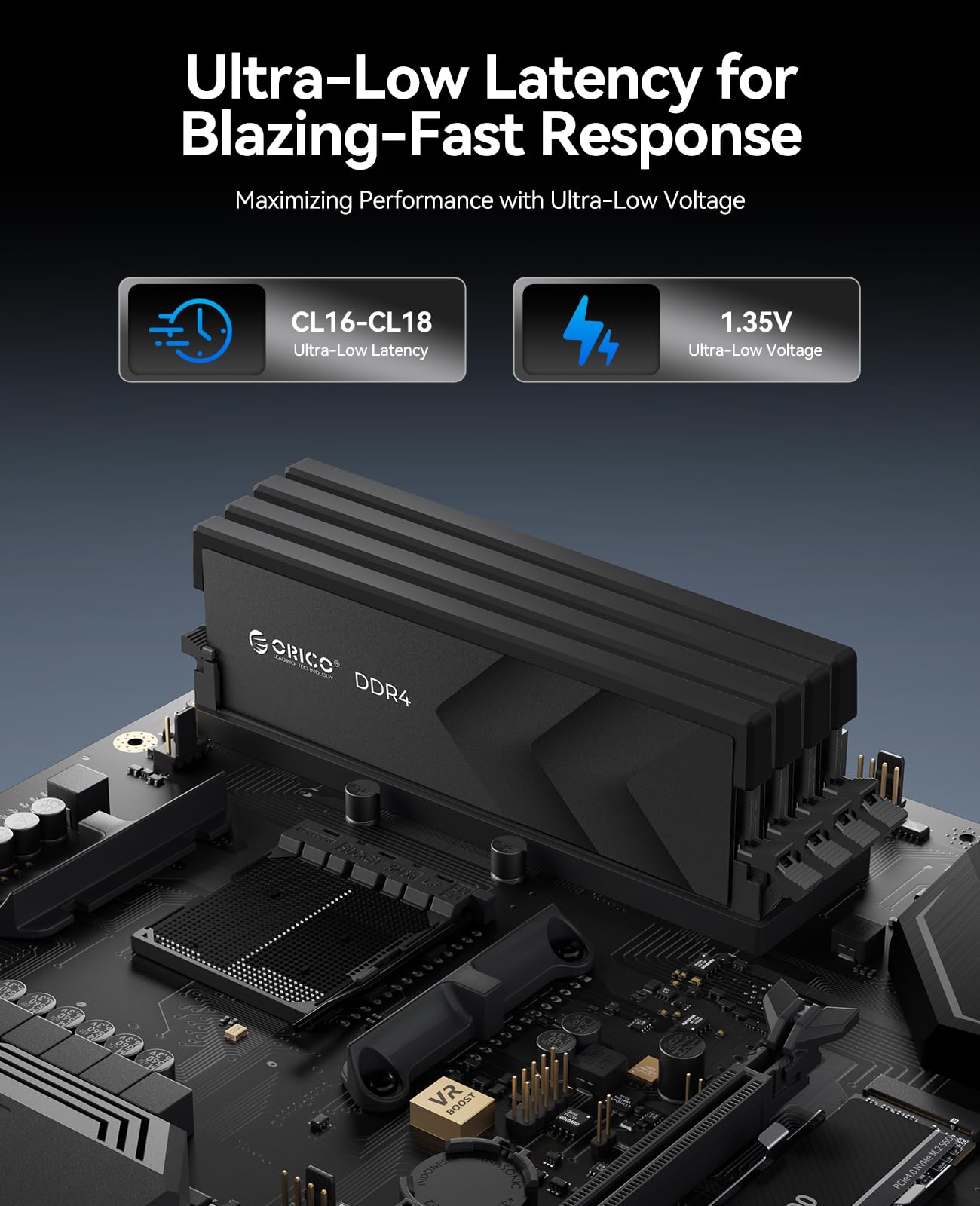 ["Outstanding Performance: The ORICO Raceline Racer DDR4 RAM is equipped with original IC, providing CL16 ultra-low latency and a high frequency of 3200MHz, significantly improving read and write speeds, reducing latency, and optimizing performance for gaming and multitasking.","One-Click Overclocking: Supports Intel XMP 2.0 overclocking technology, allowing users to overclock with just one click without manual adjustments, ensuring efficient and stable system performance.","Highly Efficient Heat Management: Features industrial thermal paste and 1.5mm aluminum alloy heat spreader, effectively lowering temperature and extending memory lifespan for stable performance during extended use.","Energy Efficiency: Operating at only 1.35V, it reduces memory power consumption and heat generation significantly, lowering the risk of system errors and improving overall stability.","Easy Installation: Plug-and-play design with automatic detection, no complicated settings or additional tools required, allowing for quick installation and instant system performance upgrade."]