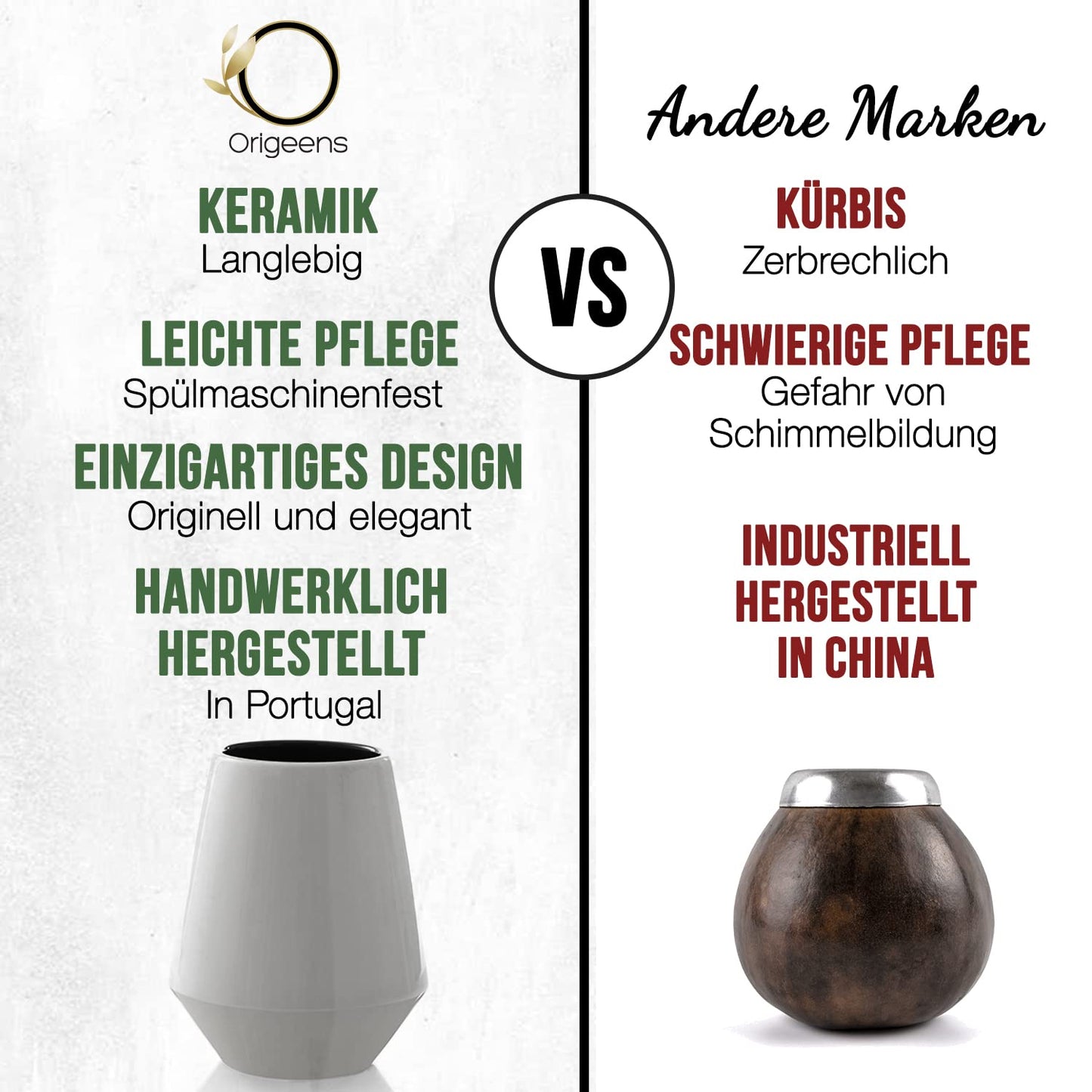 ["πΏ MATE TEA CUP AND BOMBILLA - Mate is a traditional South American drink, traditionally offered as a sign of hospitality! It is consumed with the help of a bombilla (straw with a sieve) from a special mate cup, the so-called calabash.","π΅ MATE SET - Our Yerba Mate Set consists of a ceramic mate cup handmade in Portugal in a unique design, a stainless steel straw, and an 80g pack of organic Yerba Mate, all lovingly presented in a gift box. An ideal gift for full Mate tea enjoyment!","π€ RESPONSIBLE AND SOLIDARITY - In contrast to competing mate sets imported from China, we have consciously chosen to develop our set in a solidarity and responsible manner, while at the same time meeting our claim to keep our ecological footprint as low as possible: Yerba Mate from certified organic cultivation, handmade calabash from Portugal, box made of 100% cardboard, manufactured in France by disabled workers","π ORIGINAL GIFT IDEA - Griezmann, Messi, Obama, Pope Francis... many well-known personalities from different areas have been convinced of the positive effects of this invigorating and purifying drink, which can be used as an alternative to coffee or tea: perfect for making others or yourself happy!","β