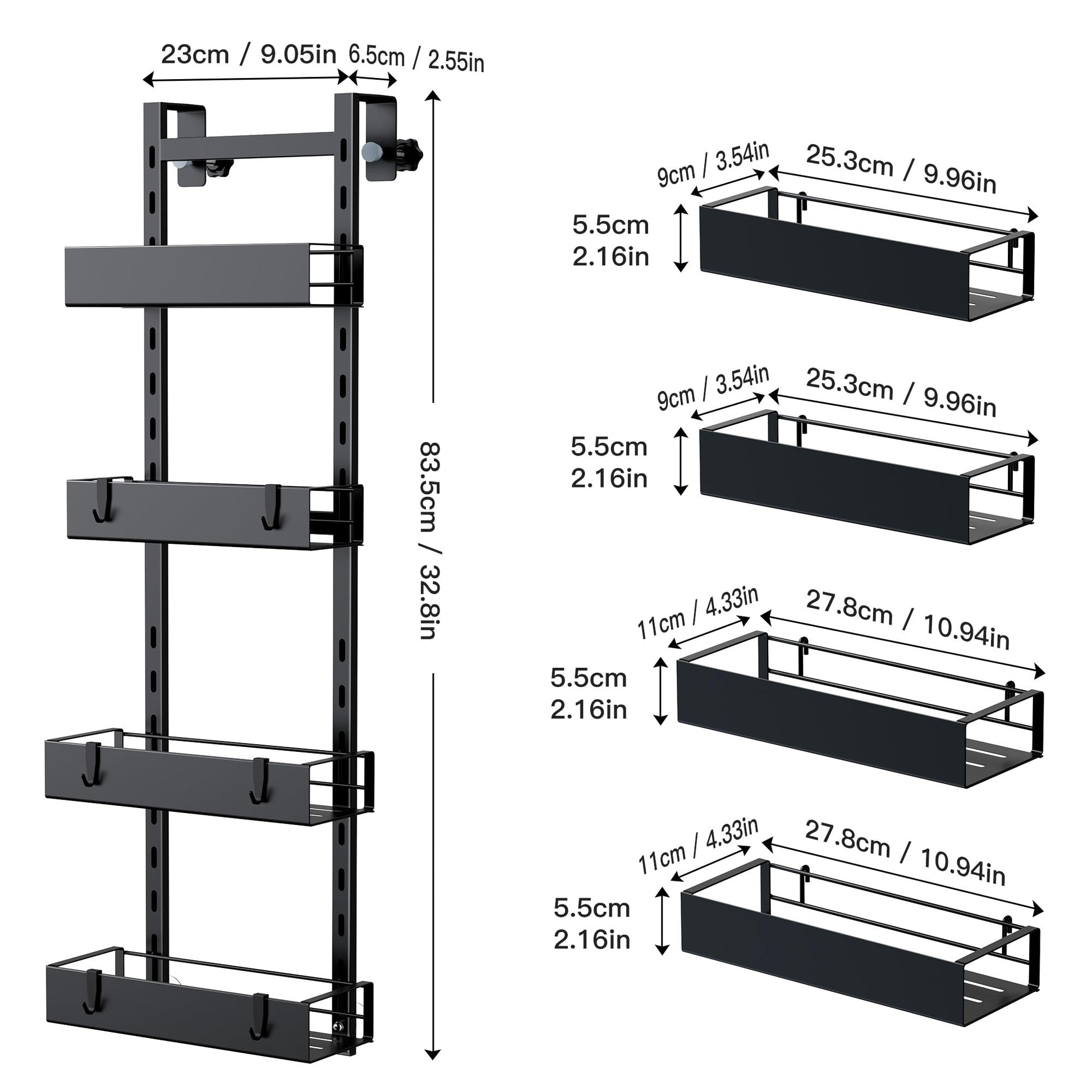"【Stable and sturdy】: Drill-free. Can be manually adjusted to fit the thickness of the door. And the shower caddy has 4 suction cups to hold it in place, double fixation. The shower shelf will not easily shake, and protect your door well.",