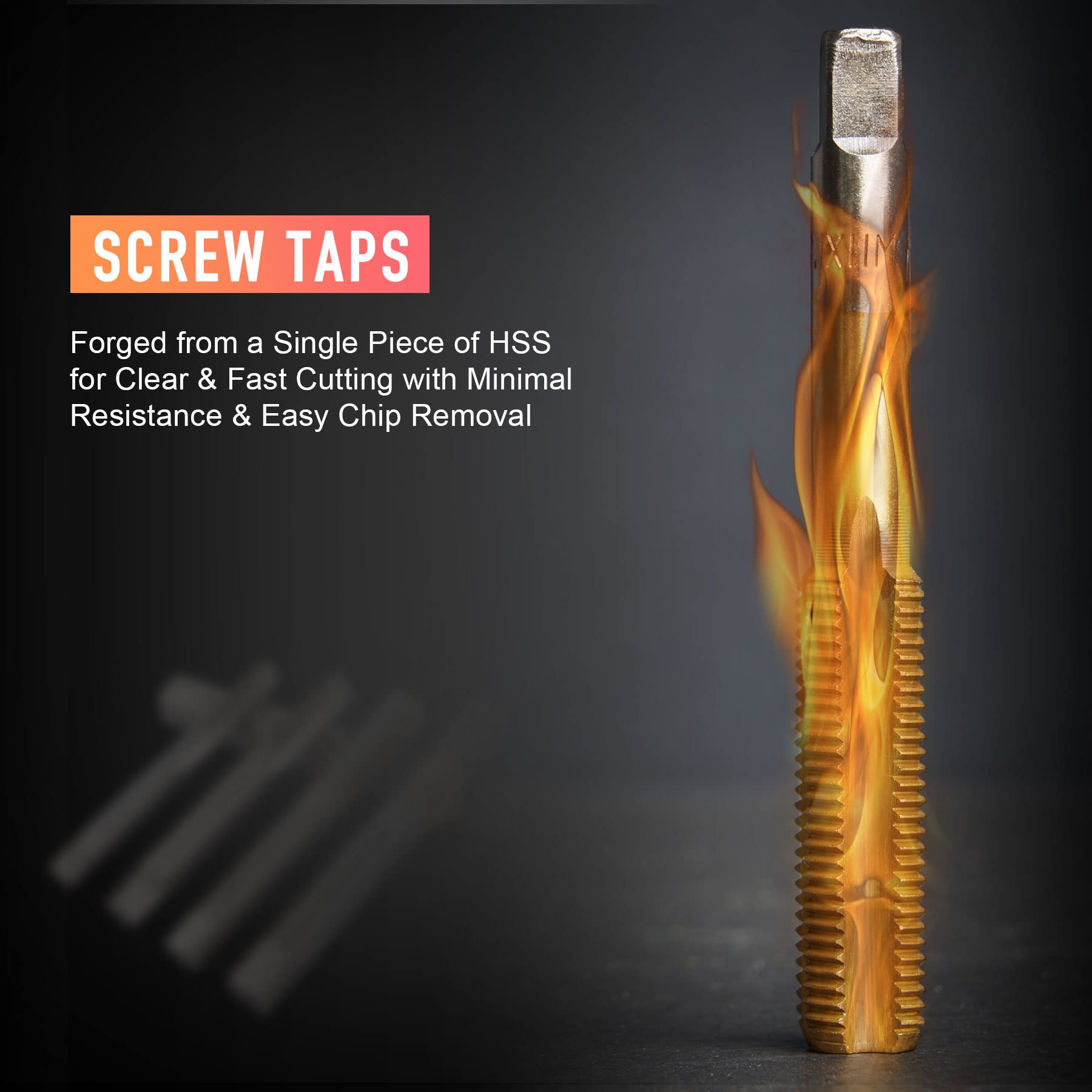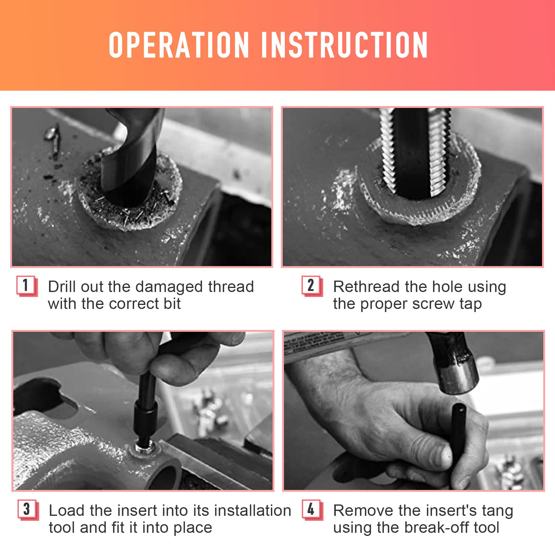 "The kit is suitable for M5, M6, M8, M10, and M12. It creates a stronger internal thread in soft metals and protects the thread from wear and damage.