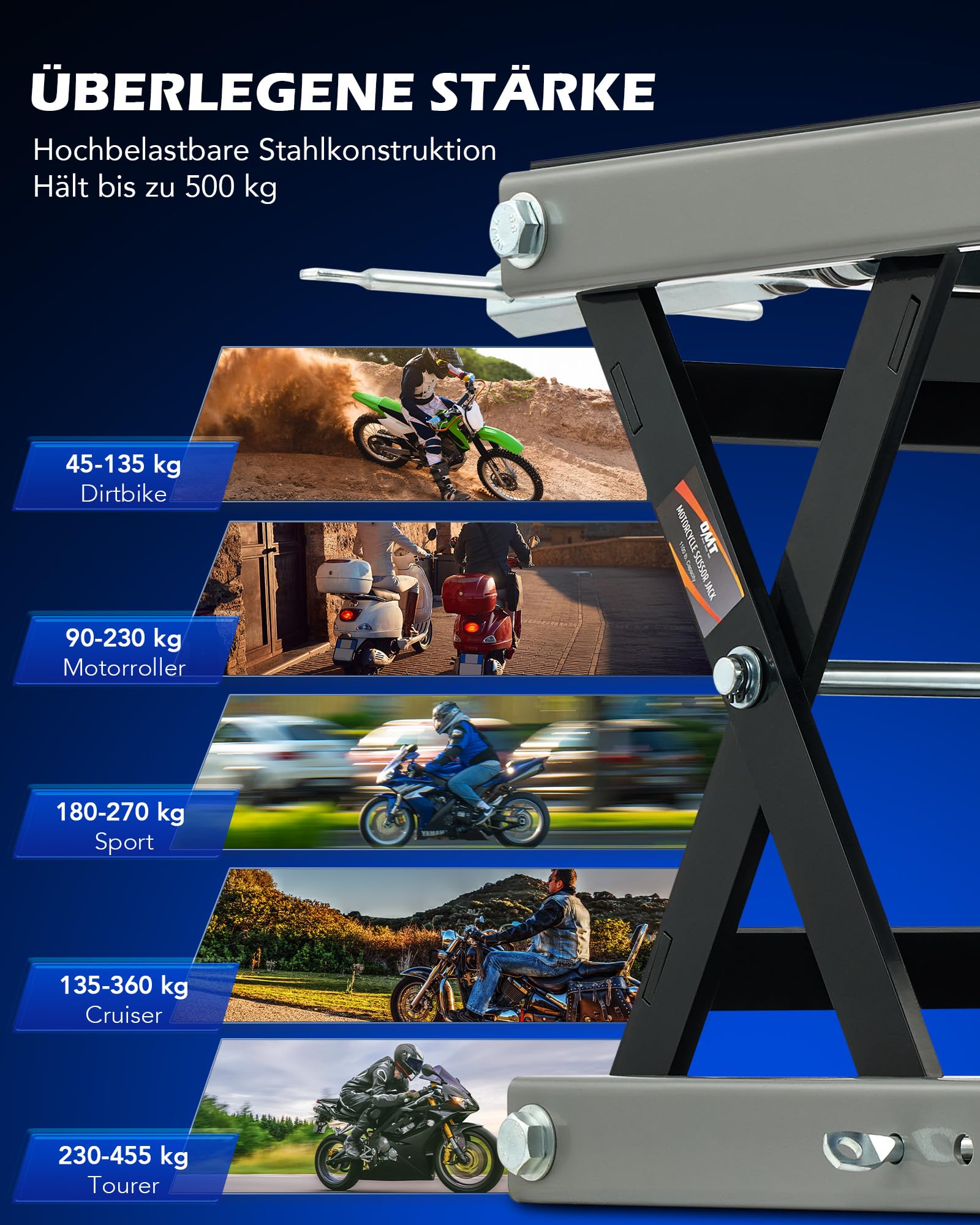 -SAFE OPERATION: This motorcycle scissor lift is equipped with an ultra-long safety bar and duplex bearings, providing an additional level of security when working on your cruisers, touring bikes, and dirt bikes.