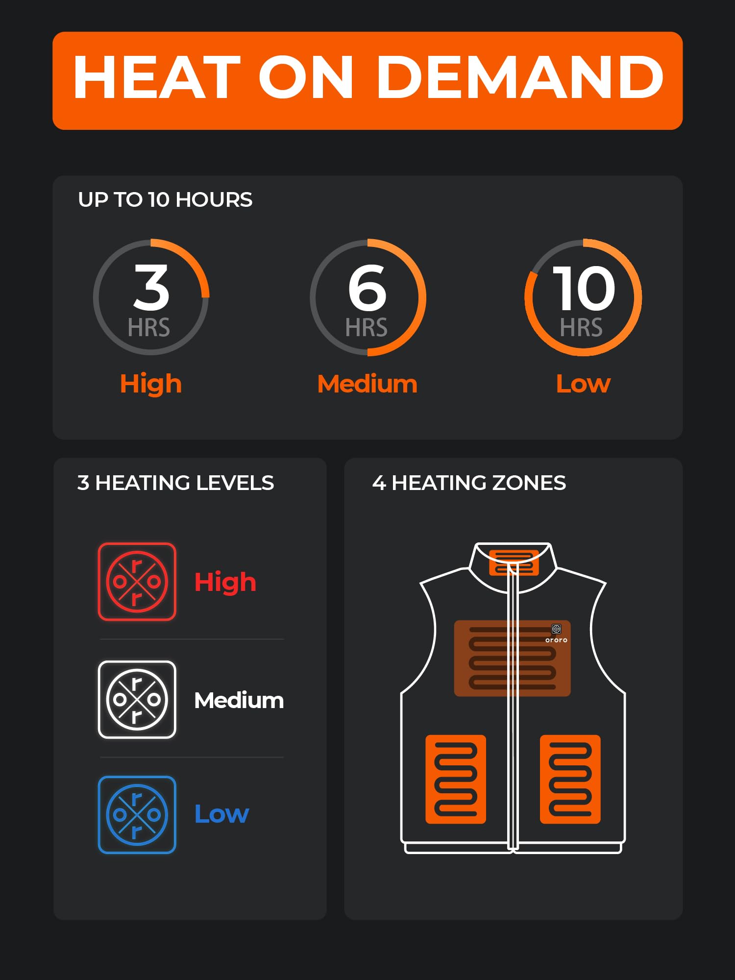 KEEP YOUR BODY AND HANDS WARM: Four carbon fiber heating elements generate heat at the collar, in the middle of the back, and below two pockets for full-body warmth. Three heat settings can be adjusted with a simple button press.