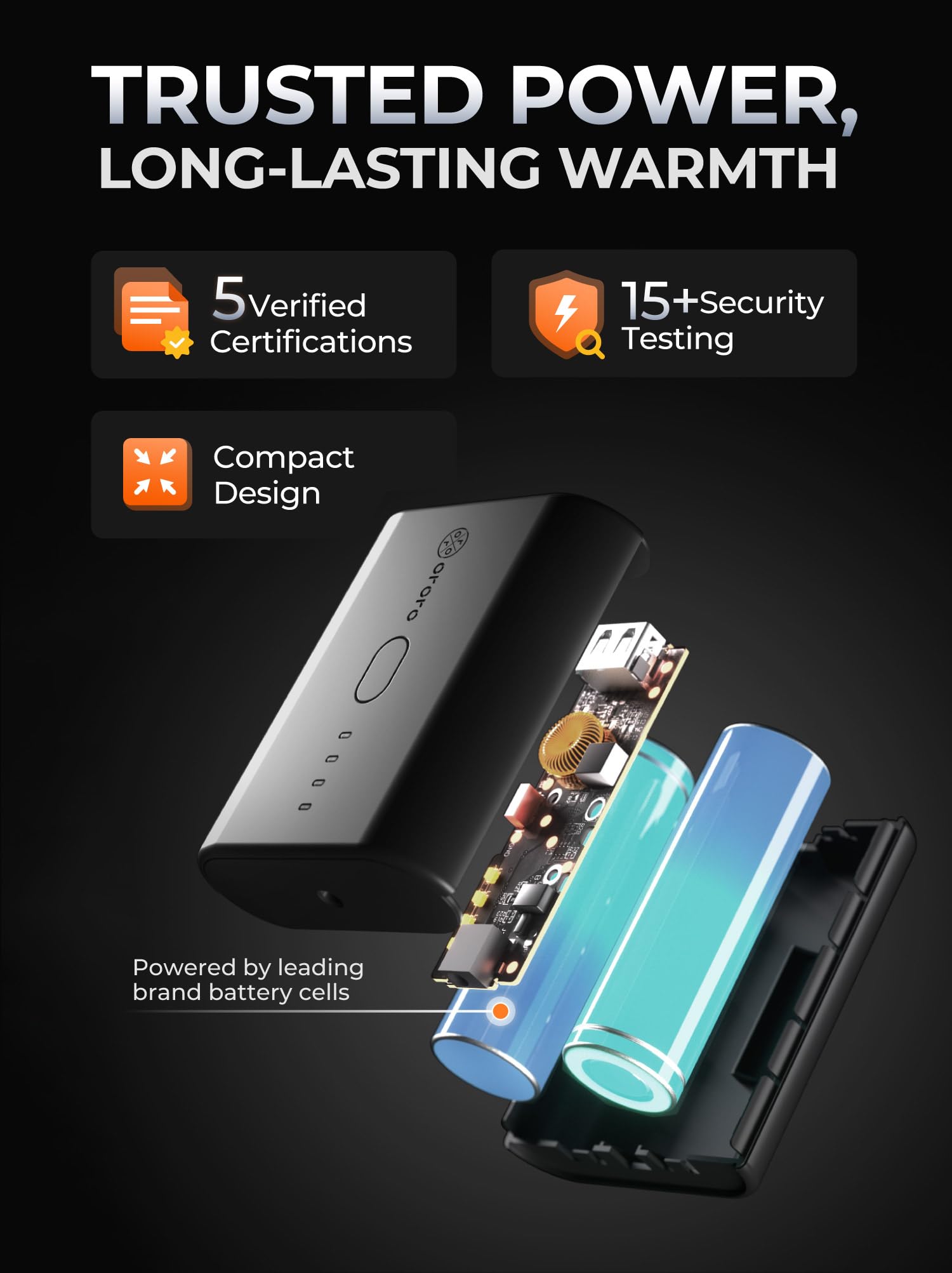 FAST AND LONG-LASTING WARMTH: Rapid heating in seconds with 7.38 V CE/UL certified battery; Up to 10 hours of working time on a single charge; USB connection for charging smartphones.