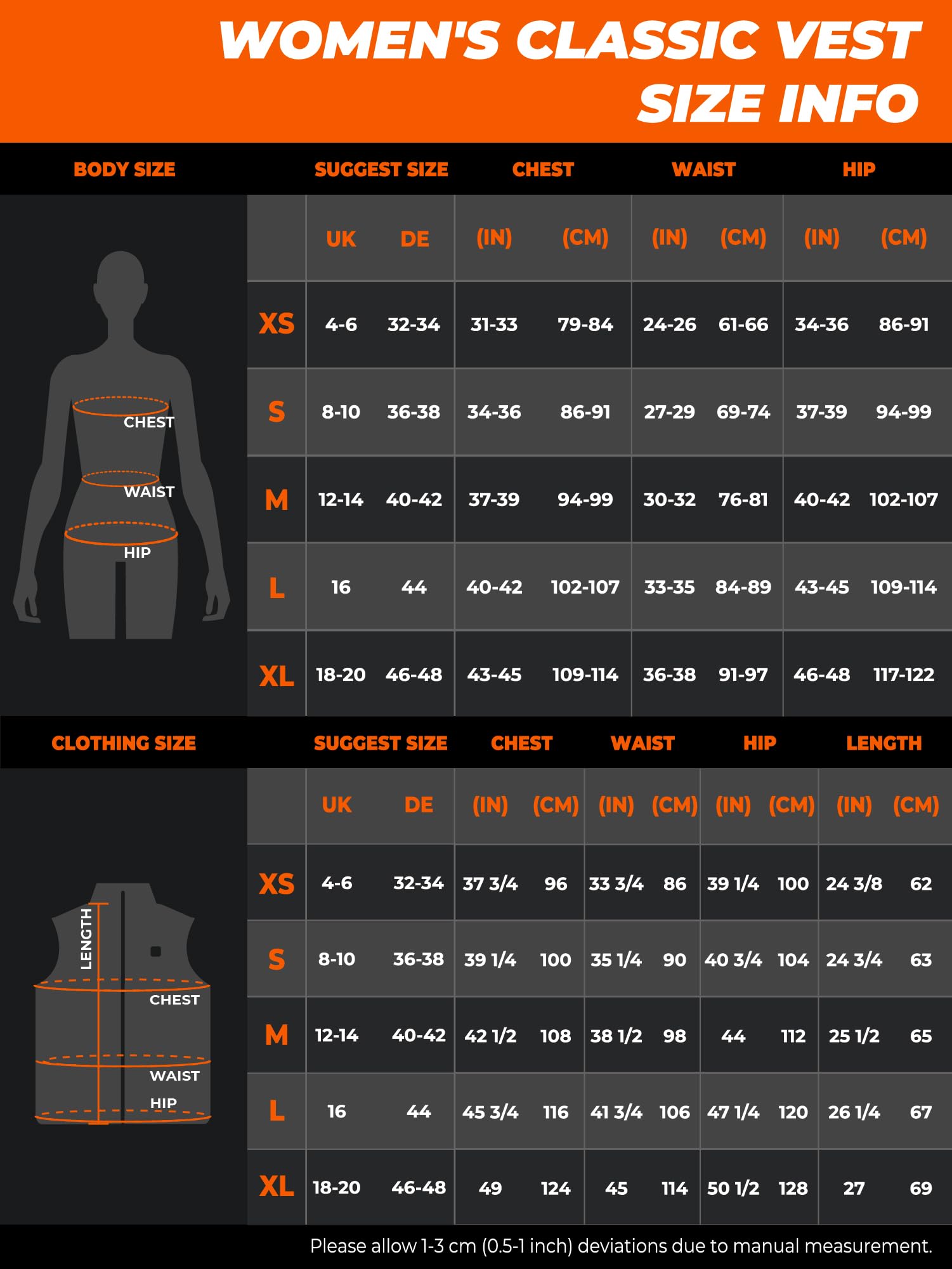 ["CHICES UND MASSGESCHNEIDERTES DESIGN: Light and insulated for unrestricted movement; water and wind resistant.","HALTEN SIE IHREN KÖRPER UND HÄNDE WARM: Four carbon fiber heating elements generate heat at the collar, middle of the back, and below two pockets. Three heat settings can be adjusted with a single button press.","SCHNELLE UND LANG ANHALTENDE WÄRME: Quick heating in seconds with 7.38 V CE/UL certified battery; Up to 10 hours of work with a single charge; USB port for charging smartphones.","FÜR ALLE GELEGENHEITEN: Perfect for daily commute, walking the dog in fresh autumn air, cheering on your favorite football team, wearing under a winter jacket, or in a too cold office!","EINFACHE PFLEGE: Machine washable; Heating elements and vest construction designed for over 50 machine wash cycles." ]