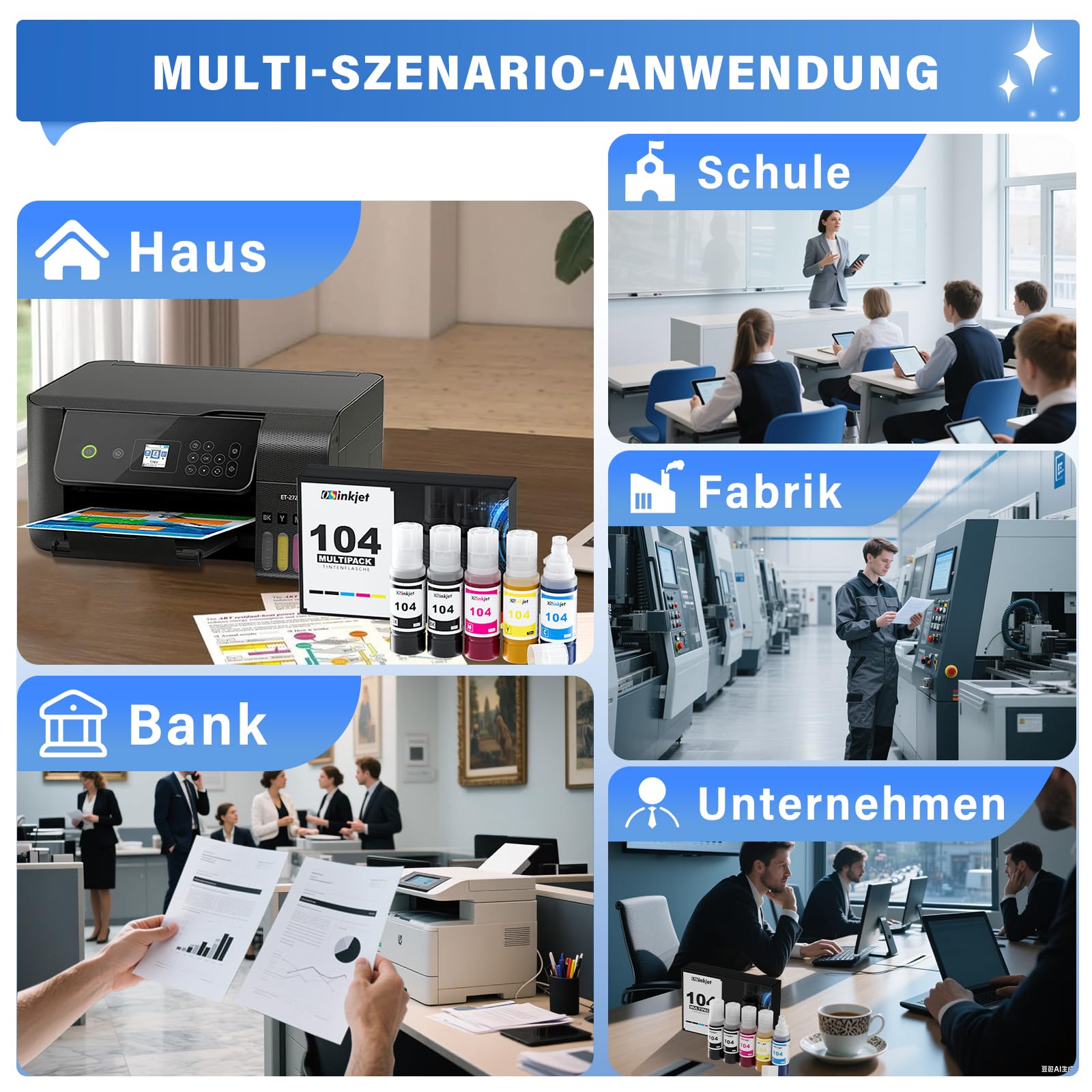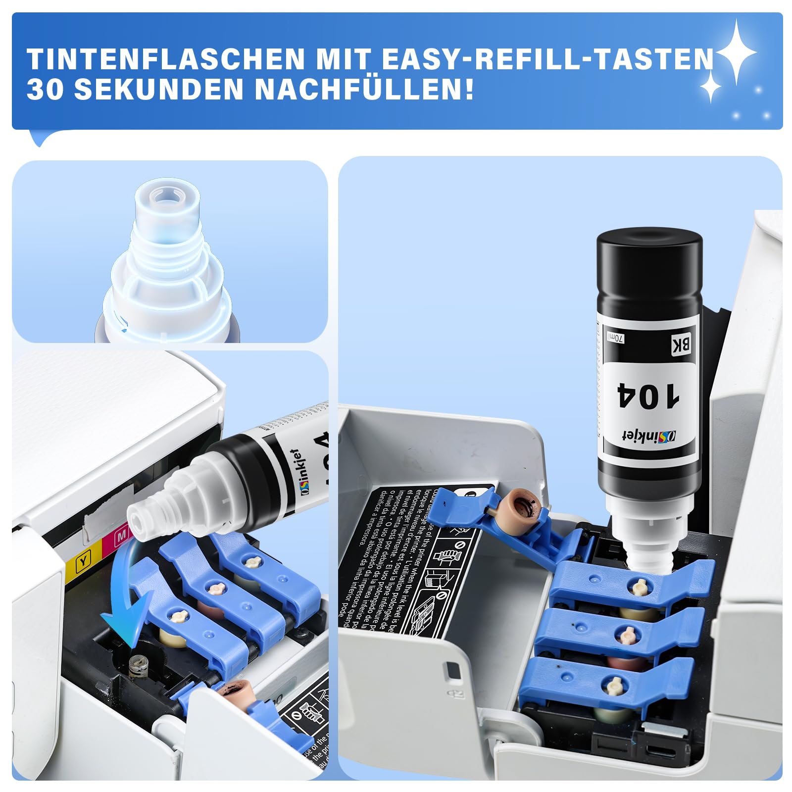["Related Printer: Ink 104 4-color multipack Compatible for Epson Ecotank ET-2870 ET-2810 ET-2820 ET-4800 ET-2875 ET-2720 ET-2826 ET-1810 ET-2710 ET-2711 ET-2712 ET-2714 ET-2715 ET-2726 ET-2811 ET-2812 ET-2814 ET-2815 ET-2821 ET-2830 ET-2840 ET-2860 ET-2861 ET-2862 ET-2864 ET-2865 ET-2871 ET-2876 ET-4700 ET-4810 ET-14100 Printer.","Auto-Stop Bottle: Printer 104 cartridges with auto-stop design, no spills, easy refilling, no dirty hands. Simply refill the working printer like the original.","Better Printing Results: Osinkjet 104 multipack has undergone rigorous testing and each color block displays a pure color. Excellent printing results ensure lifelike colors.","Page Yield: Print more pages. With 2 bottles of black 104 ink, up to 14,000 pages can be printed, and with each bottle of colored 104 ink, up to 7,000 pages can be printed (at 5% coverage on A4 paper).","Worry-Free Service: Any defective T104 104 ink can be returned or exchanged. Our customer service team is available online 24 hours a day."]