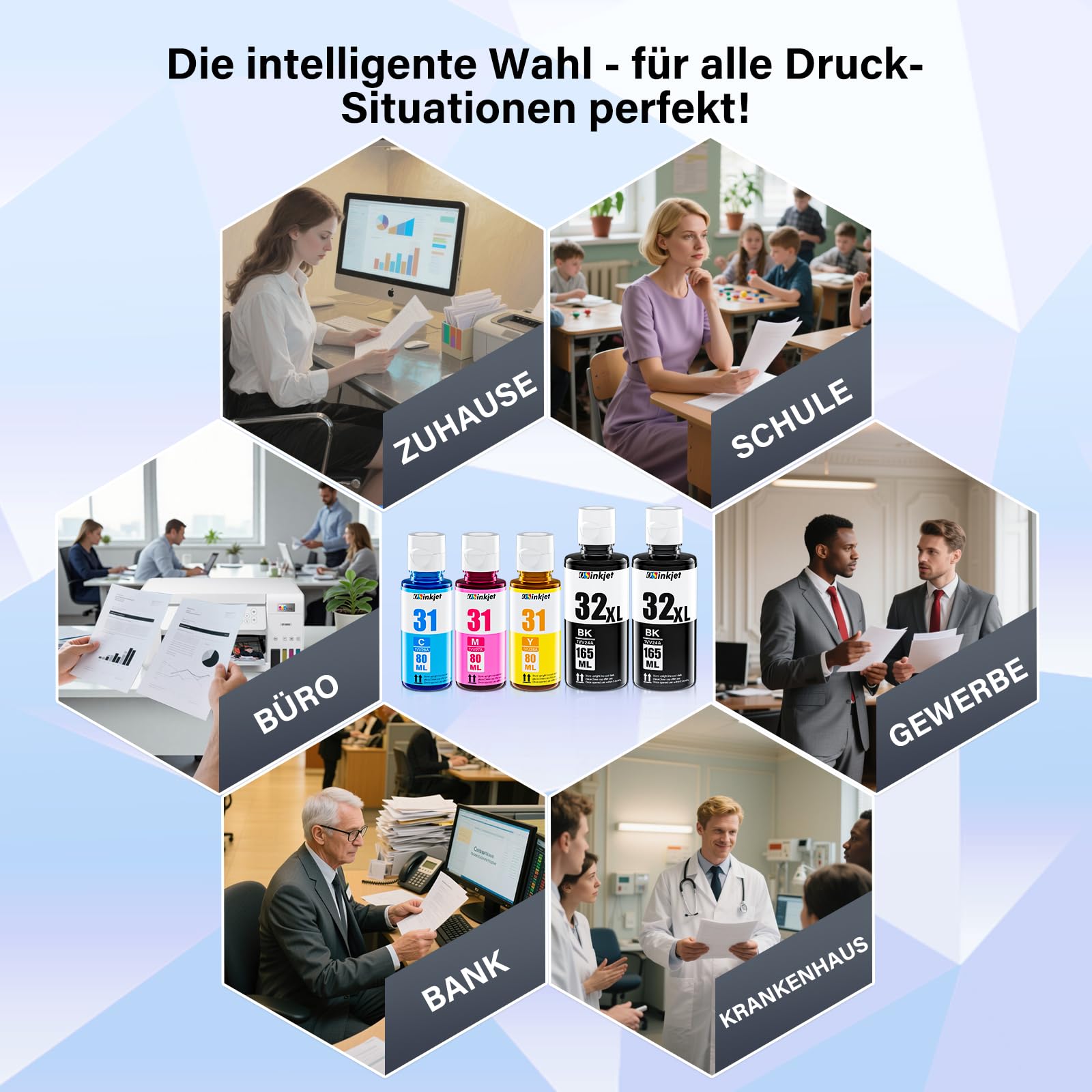"Optimize your printing: With the 31 32XL ink bottle with extra-large capacity, you can print up to 43,000 pages (19,000 pages in a 32XL black ink bottle, 8,000 pages in each 31 ink bottle set). Effortlessly unleash printing efficiency (at 5% coverage on A4 paper)."