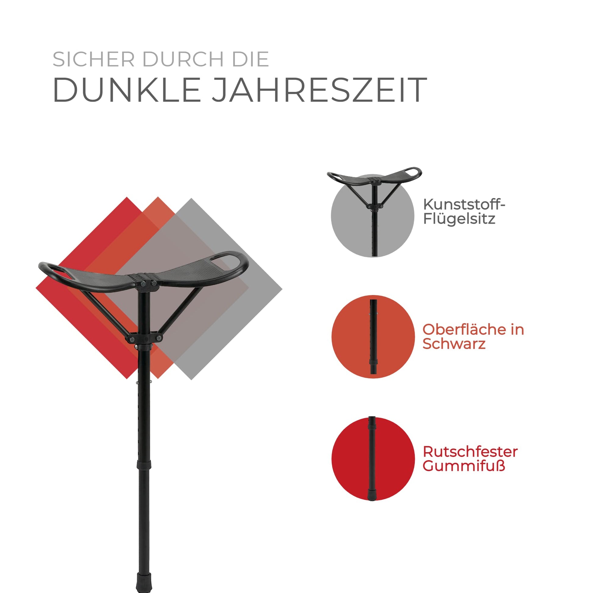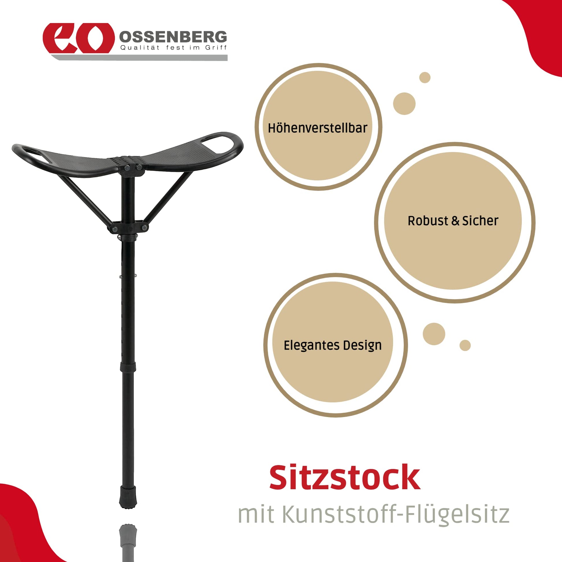 Ossenberg seat stick with plastic wing seat - walking stick with fold-out seat - height-adjustable standing stool for on the go - camping outdoor monopod chair - black