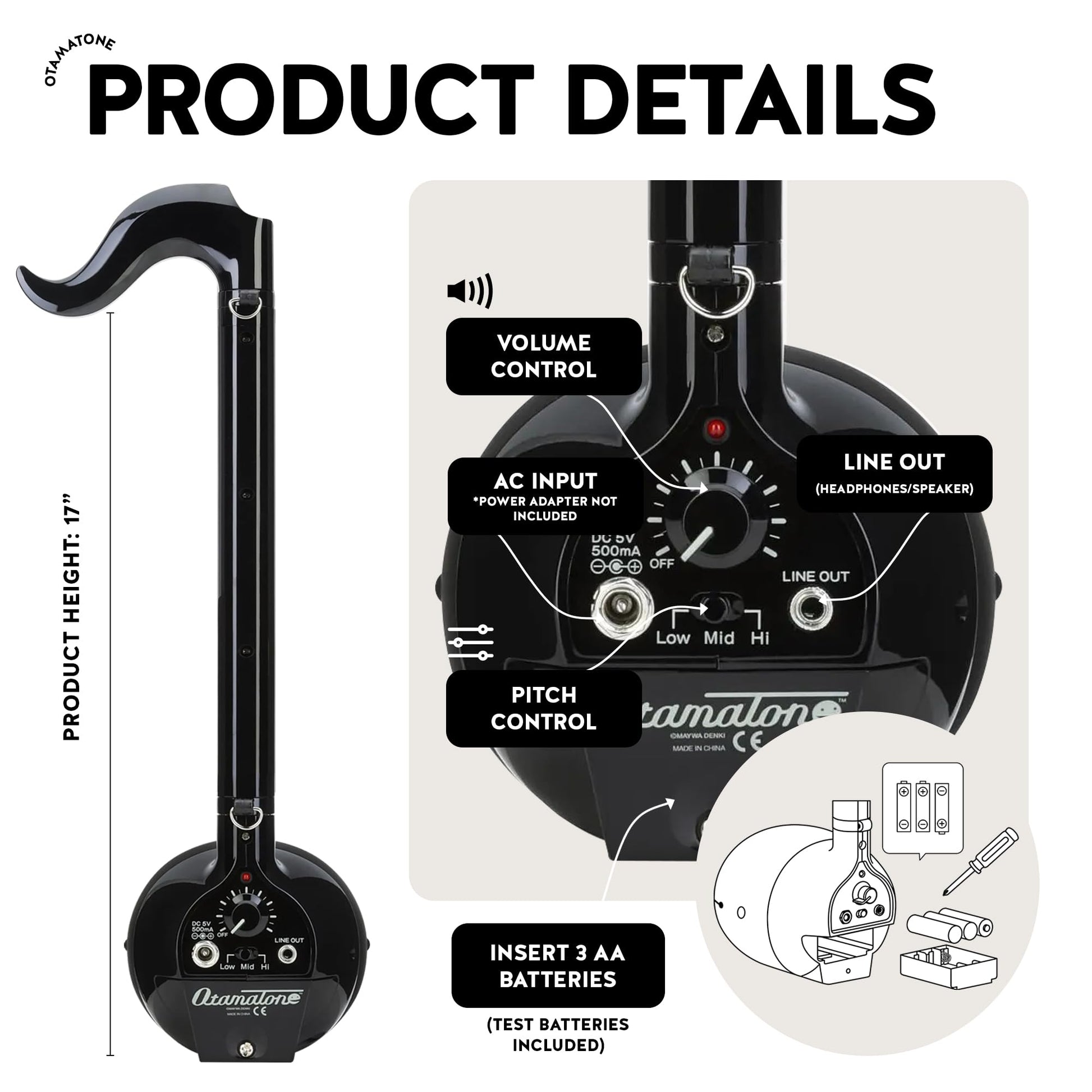 ["Musician's Dream Instrument: The Otamatone is more than just a toy; it's a cool and trendy musical instrument that allows anyone, from child to adult, to explore music in a fun and creative way. With its easy learning curve, it's perfect for beginners and experienced musicians alike!","Portable Studio: Take your music on the go! The Otamatone is a compact and portable synthesizer toy instrument that allows you to jam anywhere, anytime. This unique gift will bring joy to any music lover!","\"Musical Spielerei, Endloses Vergnügen: Making music with the Otamatone is a breeze! Simply press and slide your finger across the touch-sensitive surface to produce a range of sounds and pitches. You can even manipulate the volume, bass, and pitch to create your own unique sound effects.","Drumming up some fun with new beats: The Otamatone is a versatile musical toy instrument that allows you to explore a variety of music styles. Let your creativity run wild and discover new sonic possibilities!","Interactive Fun with Bezel-faced Charm: The playful design of the Otamatone features a soft, interactive face that changes the sound with each press. This undeniably cute musical toy is sure to bring a smile to everyone's face!","Easy, Green, and Musical: The Otamatone runs on just 3 AAA batteries (not included) and is always ready to play whenever inspiration strikes. Its durable construction ensures lasting enjoyment for years to come.","Enterprising Musician's Perfect Otamatone: Choose from three different Otamatone sizes – Deluxe (17.3 inches), Regular (11.2 inches), and Melody (3.8 inches) – to suit your musical ambitions and playing style, from seasoned musician to curious beginner. Plus, with a vibrant color palette, you can also express your personality with every note!"]