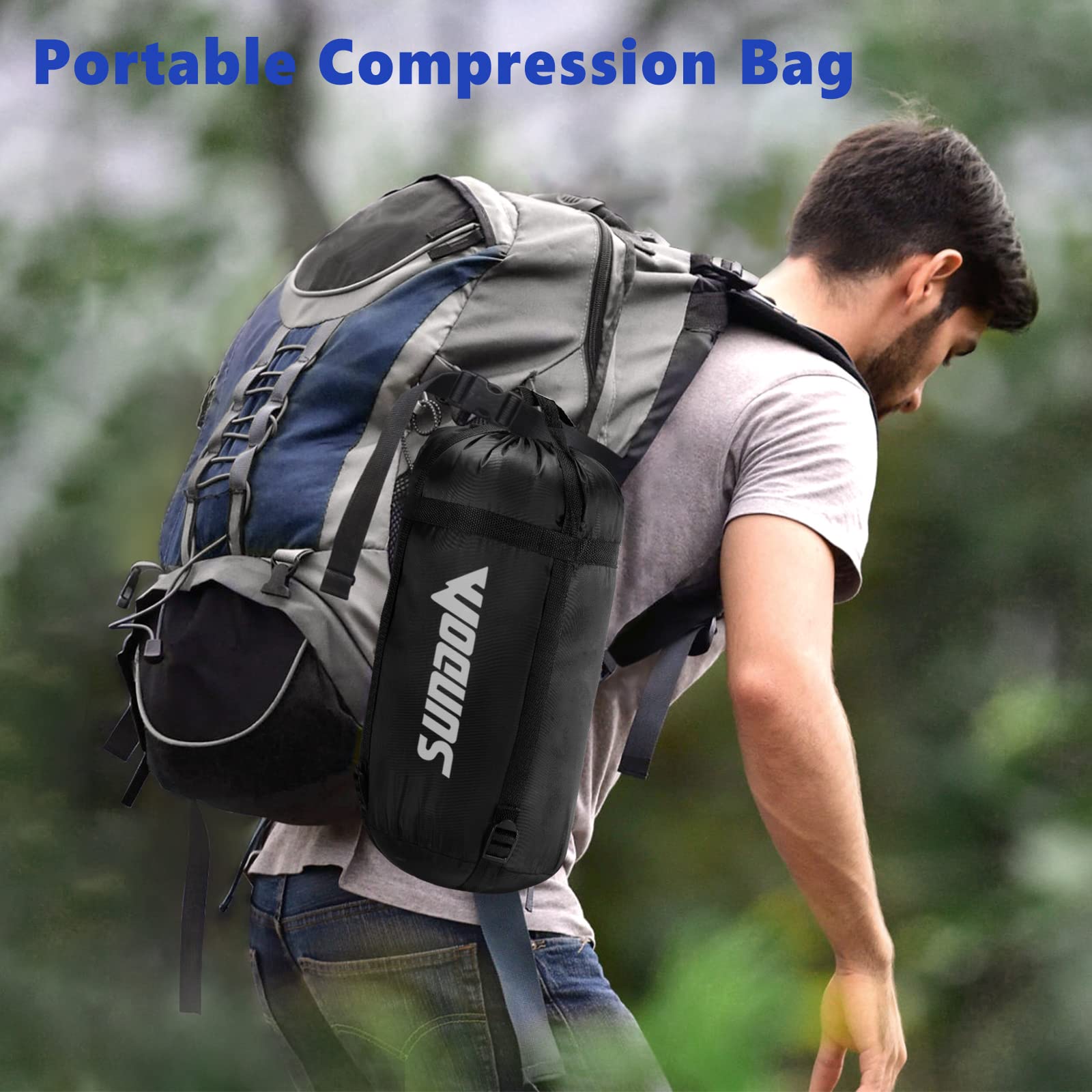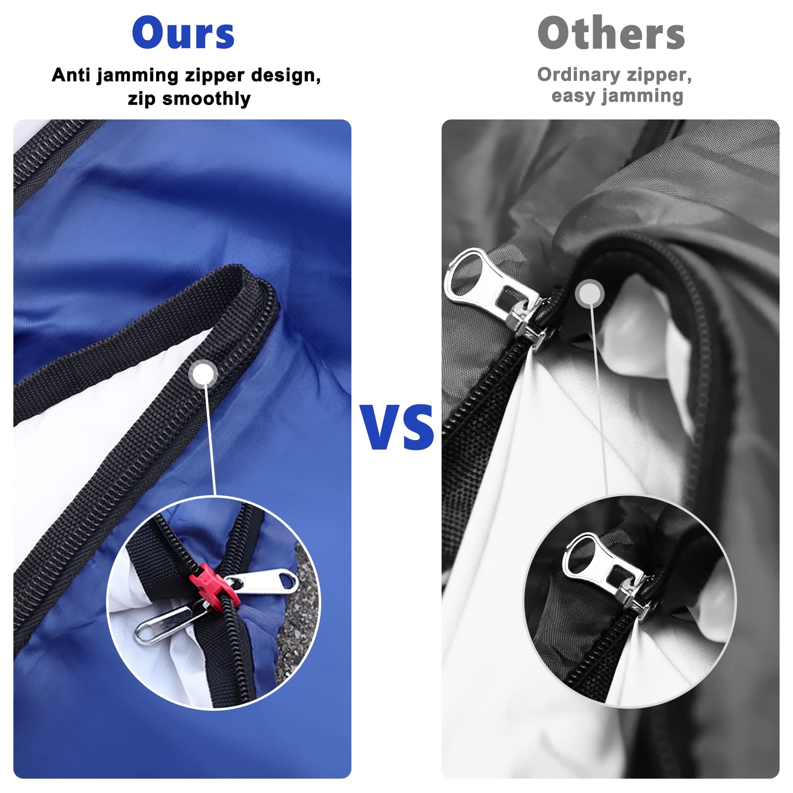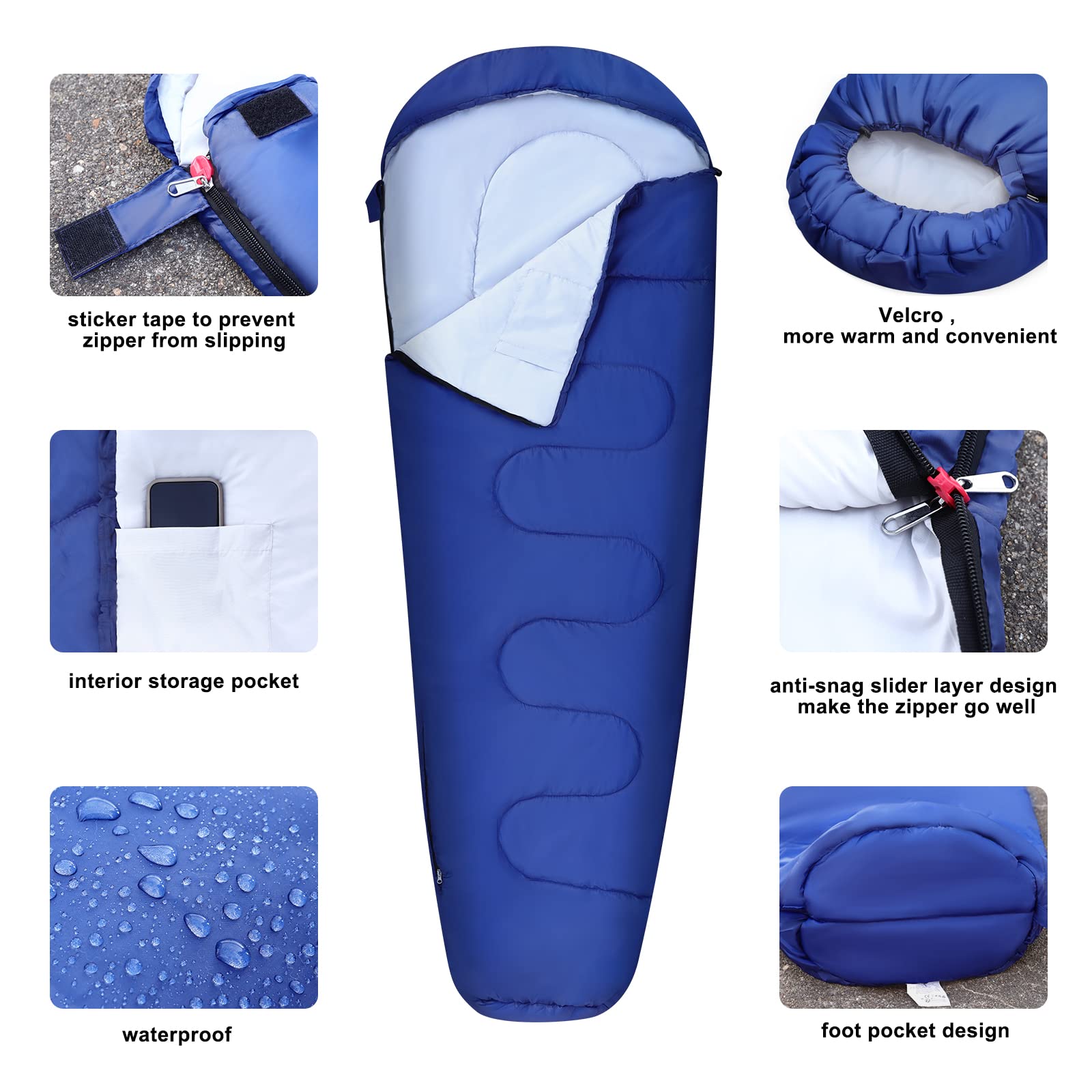 ["【Warm and Comfortable】 The sleeping bag is made of 3 types of fabrics. The outer material is made of 190T polyester fabric, which is windproof, waterproof and tear-resistant, making the sleeping bag more durable. The middle layer is filled with cotton, which can improve the air permeability and warmth of the sleeping bag. The inner lining is 210T Chunyan Spinning, more skin-friendly, soft and comfortable.","【Applicable Temperature】 After development and testing by the product department, the comfortable temperature of the sleeping bag is 46-77 °F. This applicable temperature range is for reference only, as everyone's feelings are different. I hope you can buy a suitable sleeping bag and have an unforgettable camping trip.","【Anti-Seize Double-Slider Zipper】Anti-Seize Zipper can prevent the inner fabric from getting stuck in the zipper. It can help you use the sleeping bag more smoothly. The sleeping bag also has a double-sided zipper. There are separate zippers at the feet that can be opened and closed independently. The zipper is more durable. It also has a thermal insulation function and can keep the sleeping bag warm.","【Waterproof & Machine Washable】 The sleeping bag is very water-resistant, making it perfect for field use. The U-shaped cap at the head can adjust the tightness of the cap as needed and is equipped with a Velcro closure to prevent wind and keep warm. The sleeping bag can be washed in the laundry after use. It is recommended that the washing temperature does not exceed 113 degrees Fahrenheit.","【Lightweight and Portable】 The sleeping bag is 86.6 x 31.5 inches in size and very spacious. After use, the sleeping bag can be placed in a 14.6 x 7.1 x 7.1 inch storage bag weighing only 2.2 lbs. It can be carried with you, making it a good companion for camping trips."]