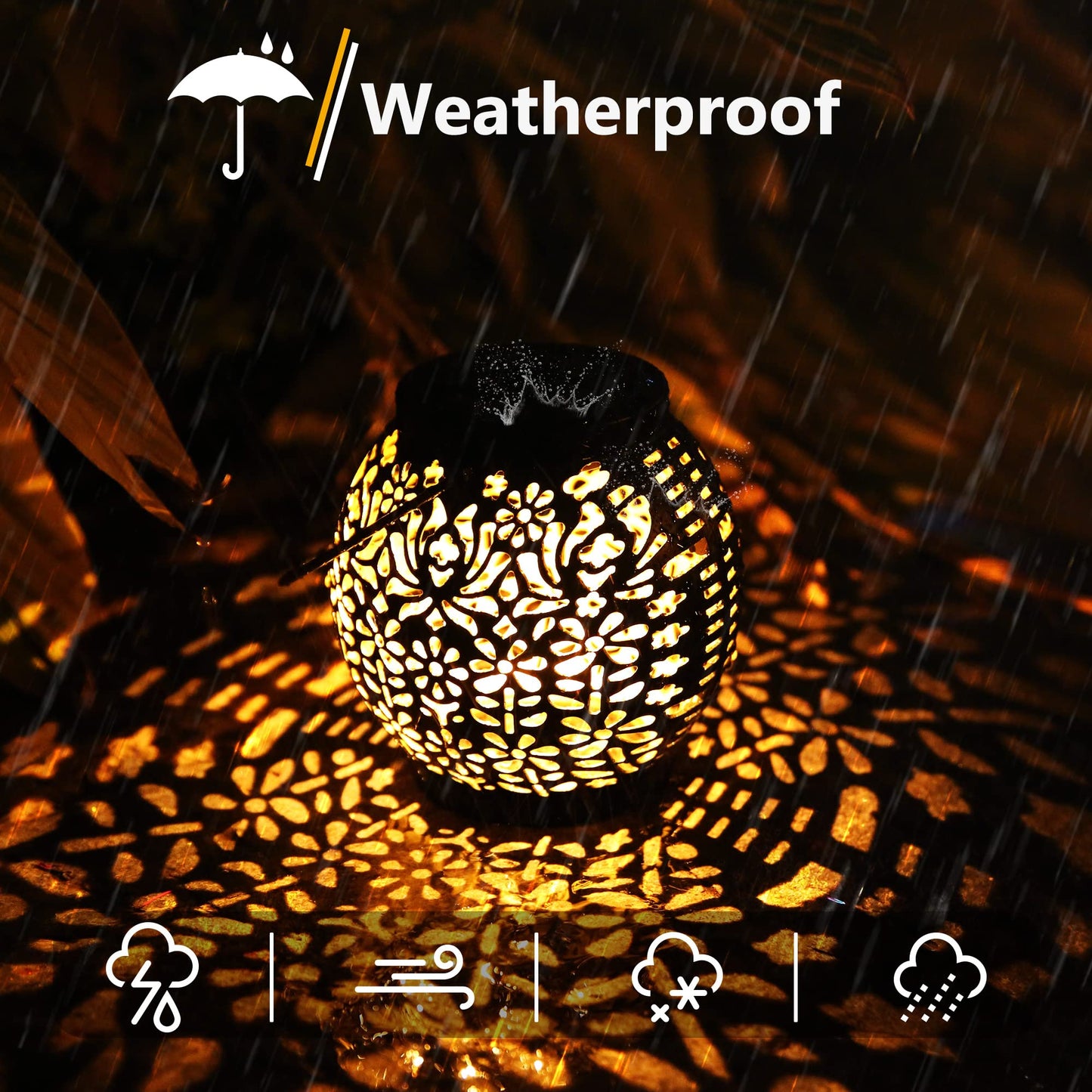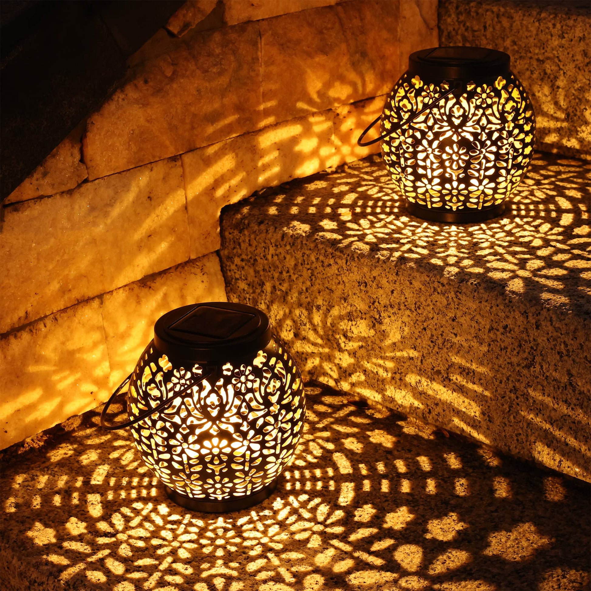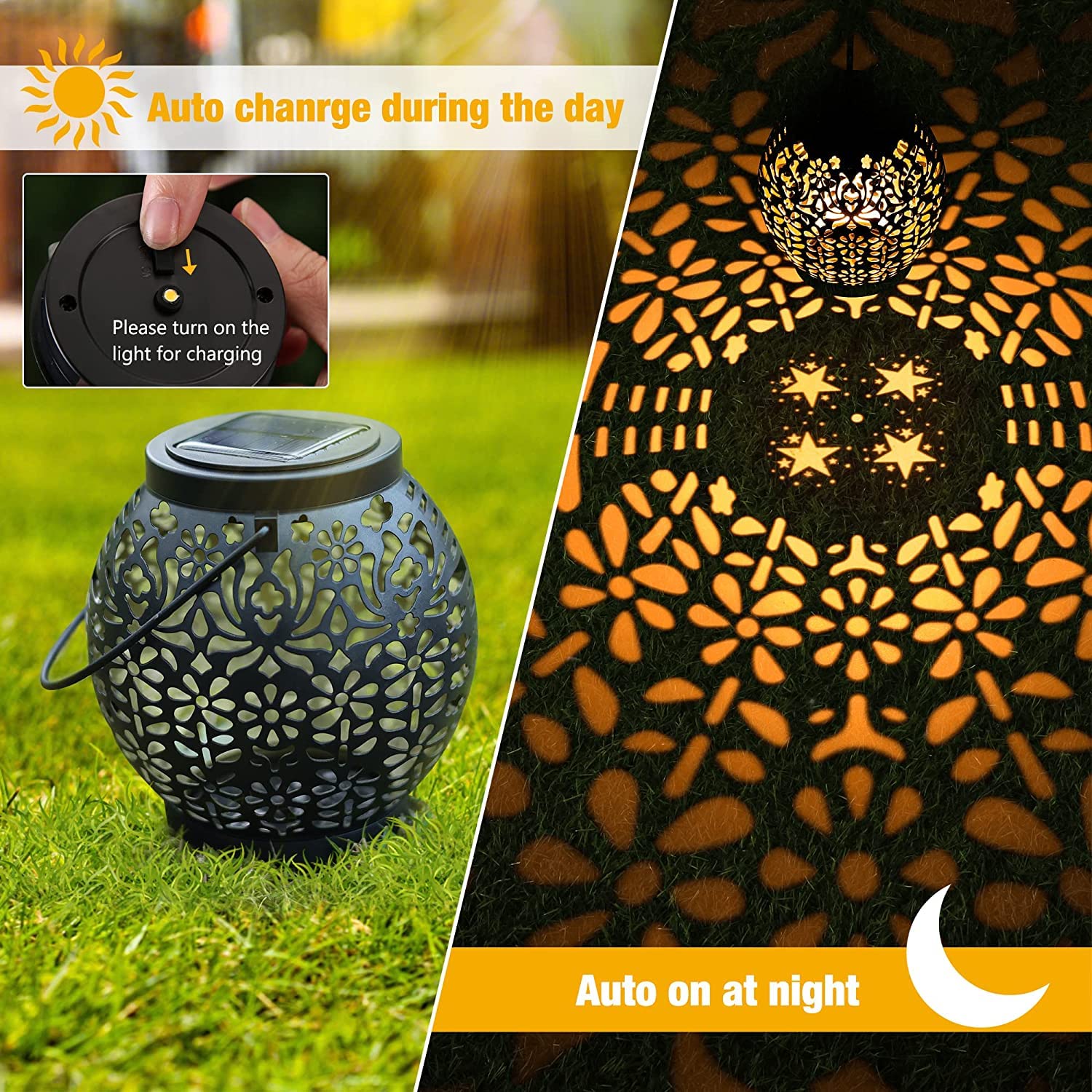 ["Unique Solar Lantern with Star Pattern】Our outdoor solar lights are designed with a hollowed-out retro pattern, and at the bottom of the lantern is a star pattern that is beautiful and unique. Create beautiful visual effects to create a romantic and cozy atmosphere. It is an ideal gift for your children, lovers, and families.","【Auto On/Off】 This hanging solar lamp automatically turns on at dusk and off at dawn. No battery or electricity required, it is truly energy-saving, helping you save money. The solar lights can work for up to 8-12 hours on a full charge. ✦Note: Make sure the switch is "ON" before charging.","【2 Ways to Use & Installation】 There is a convenient hanging hook that allows you to hang it on trees, porches, pergolas, or a shepherd's hook. The garden lantern emits a soft, warm light at night and displays a vibrant, pretty pattern on table, floor, or wall. No additional tools or cables are required. Simply turn on the light and place it in a spot without obstructions.","【Waterproof & Durable Solar Lantern】The outdoor LED solar garden lantern is IP65 waterproof, heat-resistant, and frost-resistant, so you don't have to worry about rain or snow, perfect for outdoor use. Corrosion-resistant ABS plastic ensures long life and durability.","【Solar Lights for Garden】The solar outdoor lights provide much-needed illumination and cast a beautiful light. It is the perfect decoration for indoor, patio, balcony, gardens, decks, yard, pathways, driveway, creating a romantic or festive atmosphere for Mother's Day, Christmas, Halloween, party, wedding, holidays, anniversaries, camping, BBQ, pool, beach, etc."]