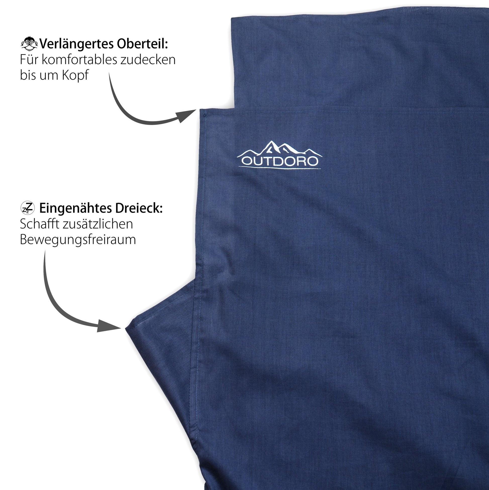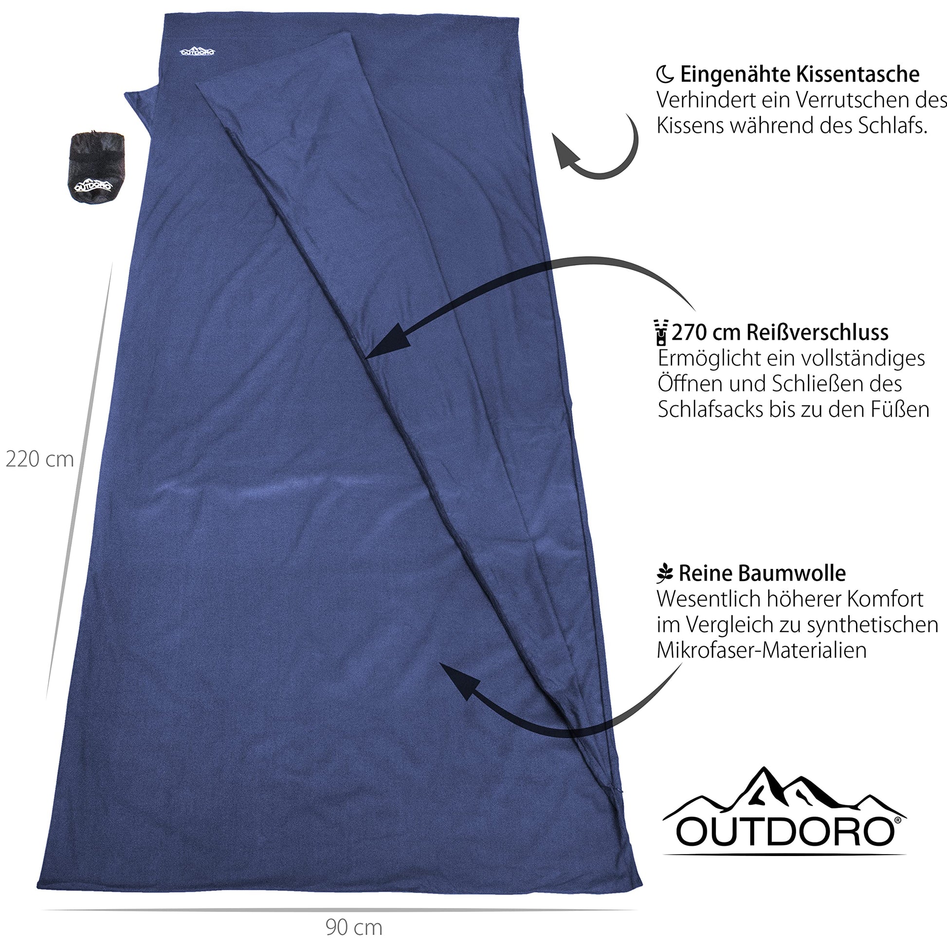 ["LIGHT, COMPACT, VERSATILE: The Outdoro sleeping bag stands out with its compact size and weight of only 350 g. Compared to other sleeping bags, our summer sleeping bag fits in any backpack. The sleeping bag is therefore the ideal companion for mountain tours, backpacking in Southeast Asia, night bus rides or hiking tours - also usable as an insert for your regular sleeping bag, tropical sleeping bag, or as a second bed sheet. Also suitable for allergy sufferers.", "COMFORTABLE SPACE MIRACLE WITH ZIPPER: Our sleeping bag offers plenty of freedom of movement and is generously sized at 220 x 90 cm. The sewn-in pillow compartment allows you to insert a pillow and protects it from slipping. With the 180 cm long zipper, the sleeping bag can be completely opened, allowing for comfortable entry and exit from the liner. Restful sleep is guaranteed!", "HYGIENIC AND EASY TO CARE FOR: Finally, you don't have to worry about dirty bedding in hostels anymore. This travel sleeping bag ensures a hygienic stay, no matter where you are in the world! With the zipper, you also protect yourself from an unclean environment. Cleaning in the washing machine is easy and the fabric also dries quickly in the air. When used as an insert, you protect your sleeping bag from contamination.", "GENTLE TO YOUR SKIN, BREATHABLE AND ROBUST: Made of pure cotton, this sleeping bag provides maximum comfort and is breathable at the same time - an important feature, especially in hot countries. Don't fall for other models that feel like a plastic bag. With our sleeping bag, you can start your next adventure worry-free!", "PERFECT TRAVEL COMPANION: Thanks to its compact size and low weight, the Outdoro sleeping bag is the perfect companion for your next adventure. See for yourself!"]