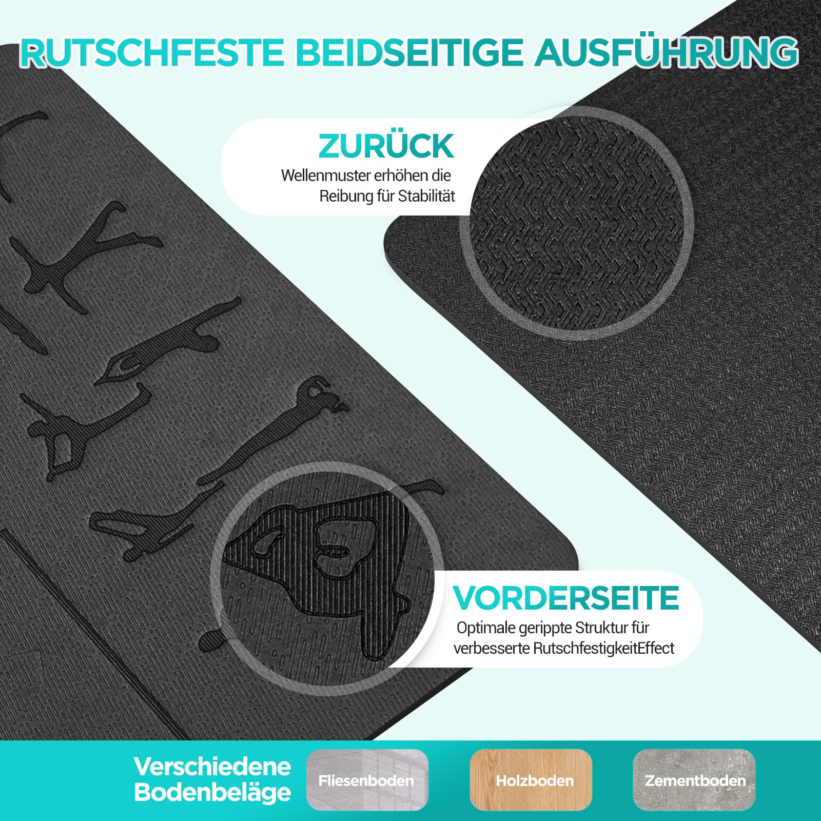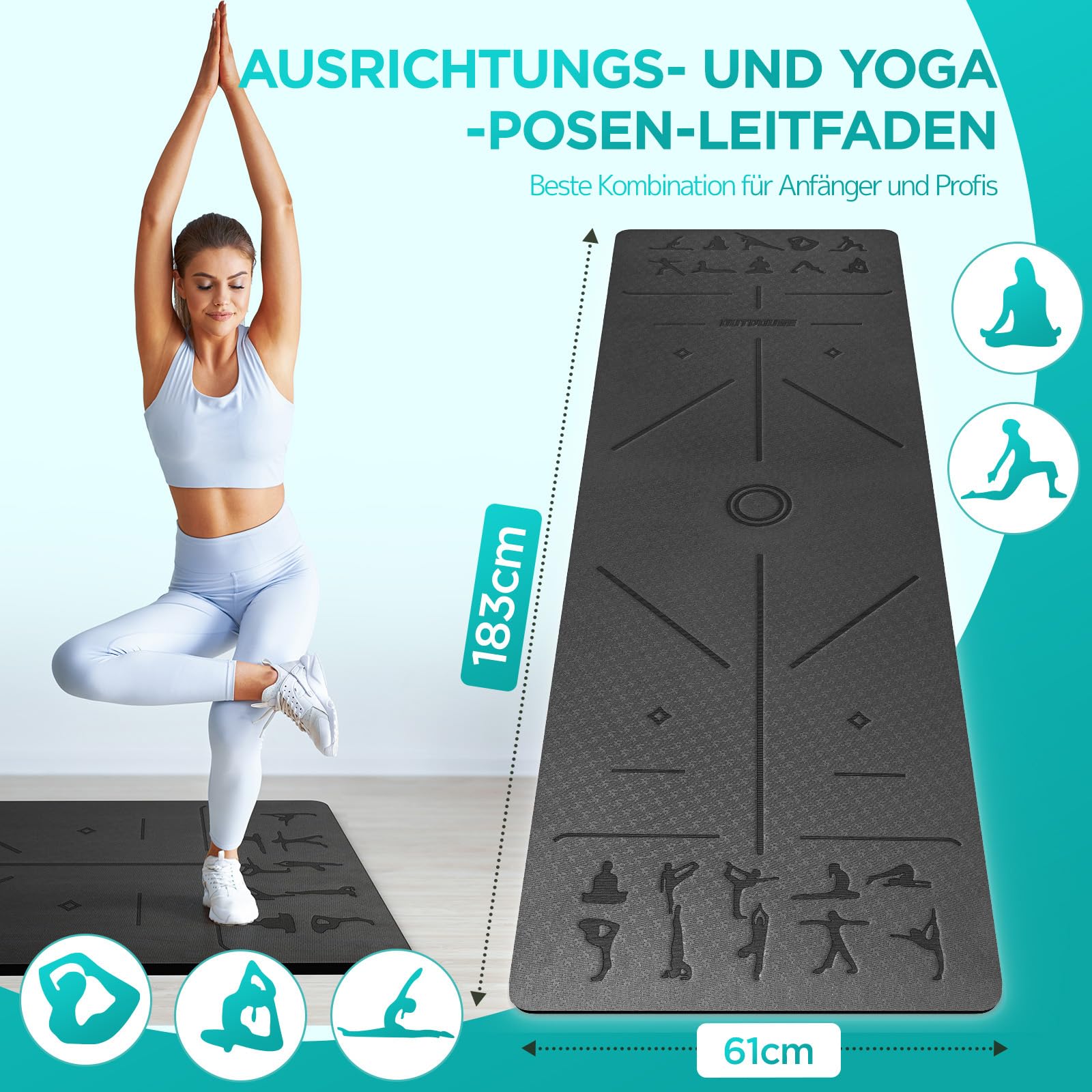 ["Revolutionary Alignment Line for Balance: Safely train with our yoga mat featuring body alignment lines to help you accurately position your movements and maintain balance to enhance your yoga experience","Laser-Engraved Yoga Pose Illustrations: Using laser printing technology, we have created clear and precise yoga pose diagrams on the yoga mat. This fitness mat helps both beginners and yogis to easily follow along without needing an additional yoga poster during practice","Tear-Resistant TPE Material: Our yoga mat is made of high-quality and dense TPE material, known for being odorless, more durable, non-slip, and tear-resistant compared to PVC and NBR. It ensures a safe and healthy practice and long-lasting use. Our 6mm thick sports mat is ideal for protecting your knees and joints during practice","Double-Sided Non-Slip Surface: Designed with a textured surface, our non-slip yoga mat provides more friction, offering excellent grip and stability, preventing any slipping or sliding during your yoga sessions. With our workout mat, you'll stay balanced and focused on your practice","Carrying Strap for Easy Portability: Our yoga mat is designed to be lightweight and easy to carry. Our exercise mat can be easily rolled up and stored in the included carrying strap, making it ideal for yoga classes, outdoor workouts, or travel","Versatile and Waterproof: Our yoga mat is suitable for various types of exercises, including yoga, planks, HiiT, Pilates, aerobics, gymnastics, meditation, and stretching. Our sports mat is also waterproof, allowing for easy cleaning and maintenance"]