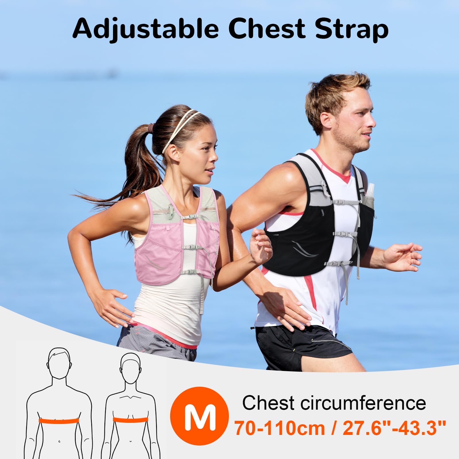 "Adjustable fit for all: Made of elastic material, the vest backpack adapts to different body types and is suitable for chest sizes from 70 to 110 cm. The adjustable chest strap reduces the feeling of restriction and keeps the backpack securely in place during movement.",