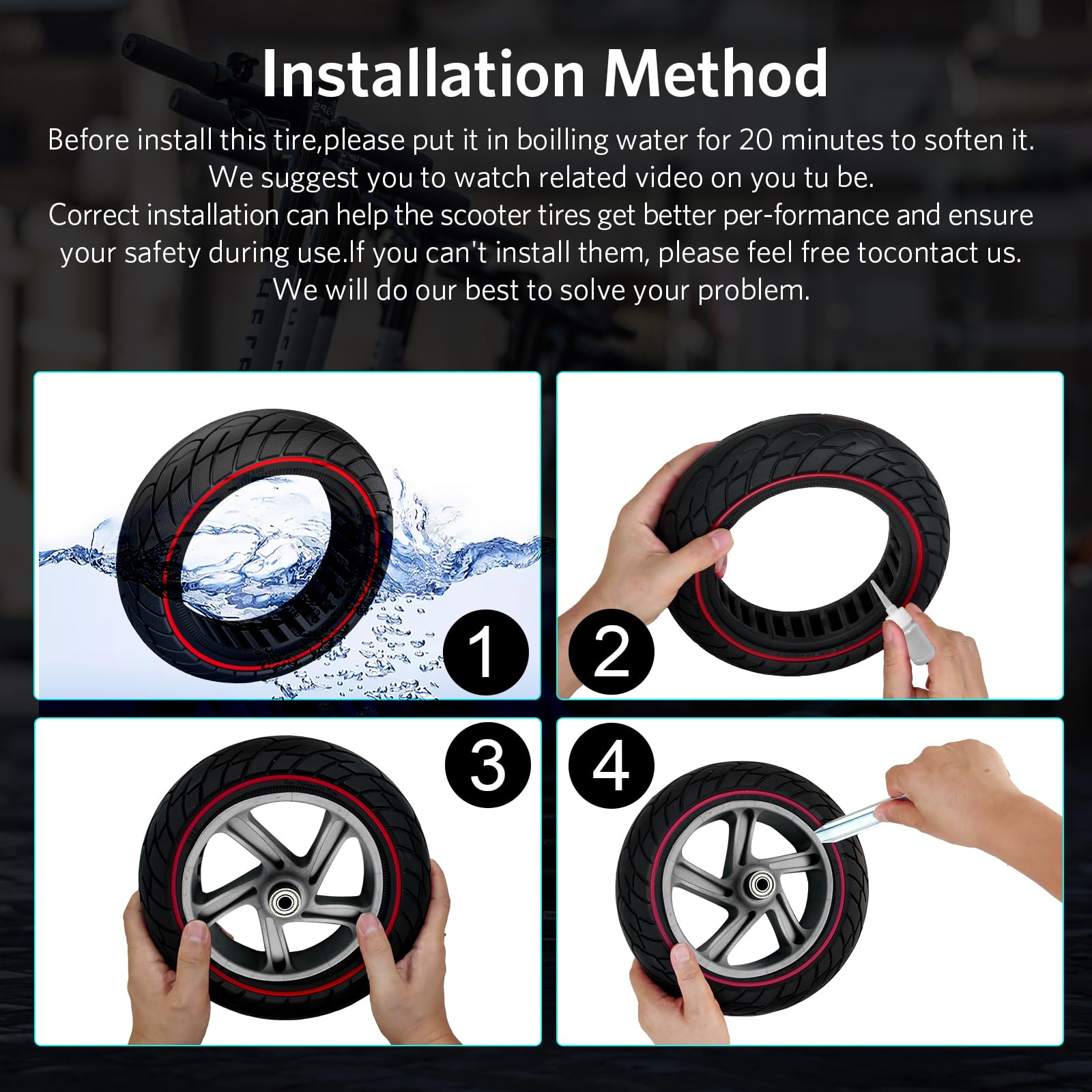 ["🛴 Solid tire size】This is a replacement tire size 10x2.125in for scooters. Suitable for scooters with an outer wheel diameter of 165mm-169mm (6.49in-6.65in), this tire has an outer diameter of 238mm (9.37in), an inner diameter of 154mm (6.06in), a tire width of 54mm (2.12in), and a tread width of 36mm (1.4in), with a mounting tool to make scooter assembly easier","🛴 Durable scooter tires】OUXI tires are made of high-quality solid rubber material for wear resistance. The surface texture of the rubber grooves provides good grip, precise stability, and maneuverability.","🛴 Puncture-proof solid rubber tire】This solid rubber tire is non-inflatable and maintenance-free, it is explosion-proof, durable, long-lasting, and you don't have to worry about punctures. The excellent cushioning ability makes the tire stronger than traditional air tires.","🛴 Excellent shock resistance】The special honeycomb design of the scooter tire gives it excellent shock absorption, impact resistance, and pressure resistance. It can be used in snow and rain. And provides you with maximum safety.","🛴 【Assembly】 Soak the tire in boiling water for 10 minutes before assembly to soften it. We recommend watching the corresponding video on YouTube. Proper assembly enhances the performance of our scooter tires and ensures your safety during use. If you are unable to mount them, please contact us. We will do our best to solve your problem."]