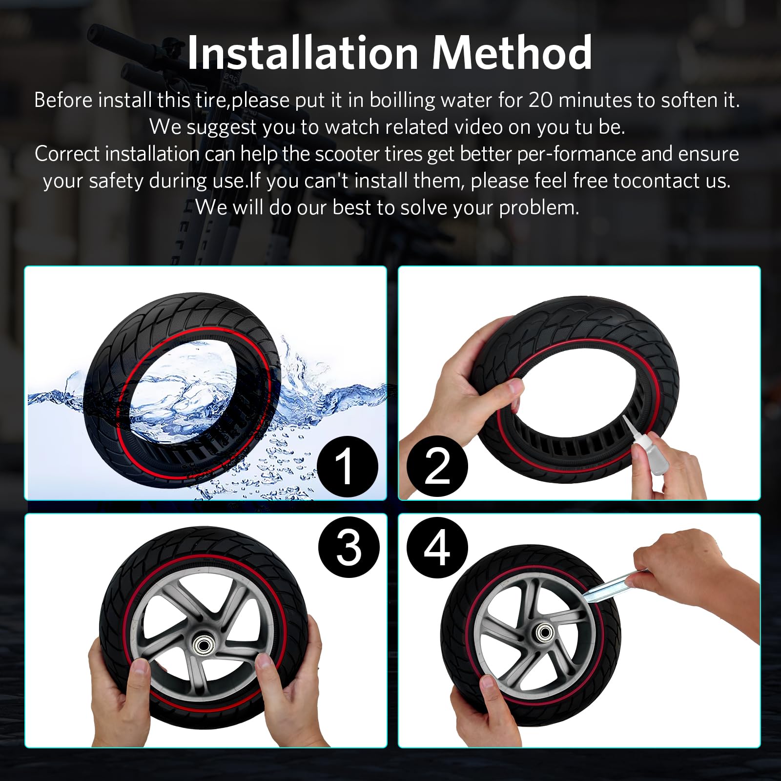 "🛴 【Installation】 Before installing the tire, soak it in boiling water for 10 minutes to make it softer. We recommend watching the corresponding video on YouTube. Proper installation enhances the performance of our scooter tires and ensures your safety during use. If you are unable to mount these, please contact us. We will do our best to solve your problem"]
