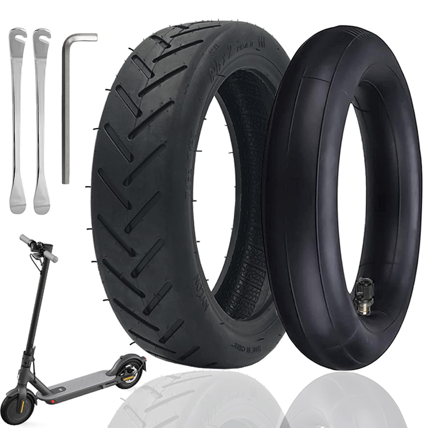["đ´ăEnvironmentally friendly Butyl Rubberă: The scooter wheel is made of Butyl rubber, which has high temperature properties (-60 â -180 â), excellent anti-permeability, aging resistance, and durability. Butyl rubber does not scratch and does not emit harmful gases, a great replacement for Xiaomi M365 or other scooters with 8.5-inch tires. 2mm thick inner tube, outer diameter 8.25 inches, inner diameter 5.5 inches. Universal for front and rear wheel, a perfect replacement wheel for scooter","đ´ăWidely usedă: The replacement tire set leaves no traces and respects all types of ground surfaces, its cushioning, non-slip, and wear-resistant effect increases comfort for the scooter on the road as well as side stability and heat dissipation. The rubberized surface is characterized by puncture resistance, energy saving, high elasticity, and sensitive operation, leading to an increasingly widespread use of pneumatic tires","đ´ăSafety & Stable Performanceă: The spiral grooved surface of the electric scooter tires leads to greatly increased grip, even on rainy/snowy days you can ride safely as usual. Unique texture and lining of the arc parts have a perfect shock noise & noise suppression effect. You can adjust the rim area for perfect deformation to ensure driving safety, operational stability, comfort, and energy saving","đ´ăEasy to installă: Scooter tube 8 1/2 x2 or inner and outer tire set is so easy to replace, just make sure the valve is facing in the right direction, it will last for thousands of kilometers without pumping. It can smoothly run on various types of road surfaces, highways, uneven paths, rocky roads, sandy roads, and uphill roads","đ´ăApplicationă: The electric scooter rubber tire is compatible with Xiaomi M365/M365 Pro/1S Gotrax GXL V2/XR Cotec Bongo A-Series and all 8.5'' scooters. We recommend that you watch the corresponding installation videos on YouTube. Proper installation can help our scooter tires perform better and ensure your safety during use. If you have any questions, please feel free to contact us, we will do our best to solve your problem"]