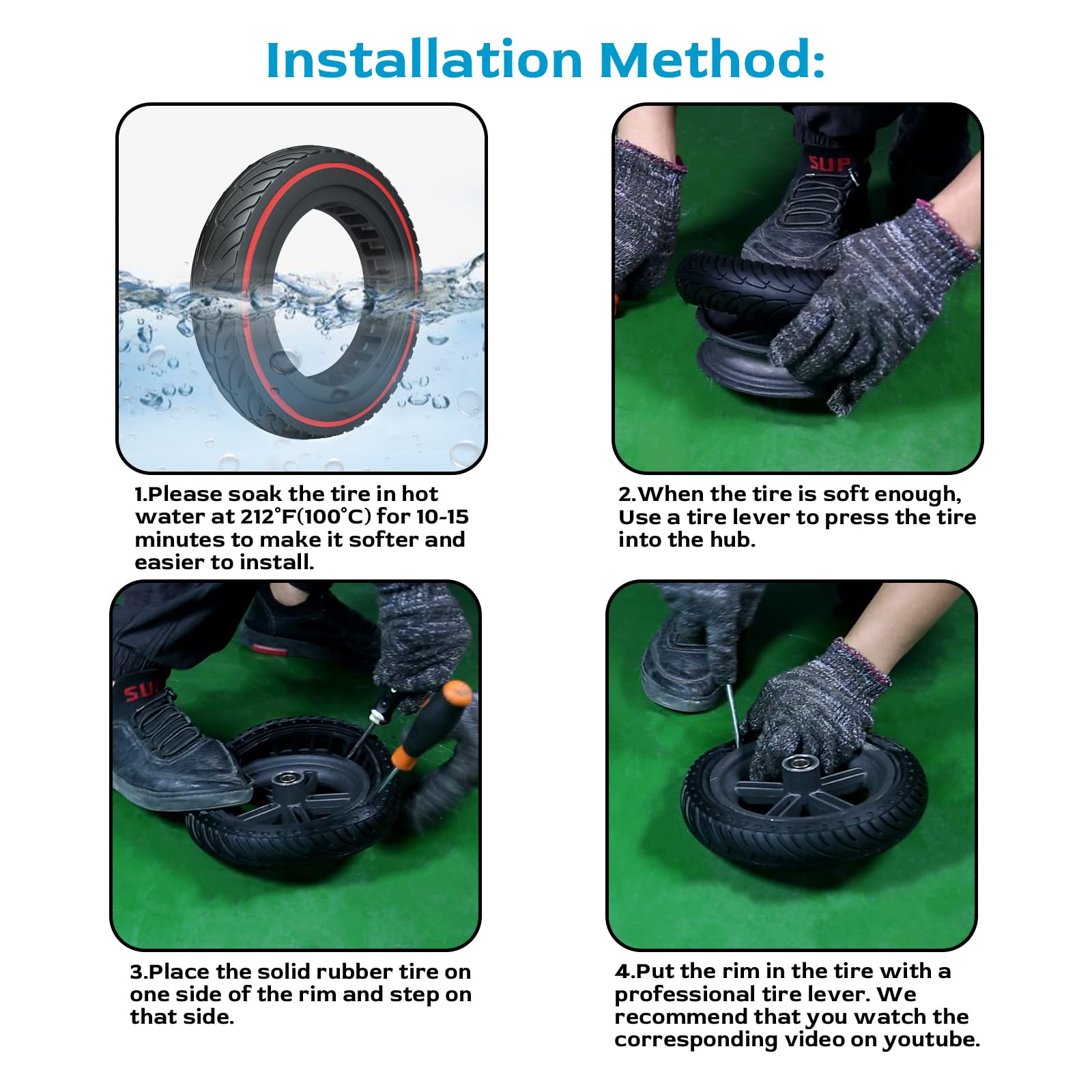 ["🛴【Upgraded Puncture-proof Tires】OUXI is a high-quality seller of solid tires for electric scooters. This is the latest updated solid tire in 2024. Compared to regular solid tires, it offers optimized performance, increased elasticity, more shock absorption, no pumping, no maintenance, no inner tube, and you don't have to worry about tire punctures. Come and decorate your scooter with this colorful tire now!","🛴【Increased Range by 25% Compared to Conventional Rubber Tires】This improved solid rubber tire has better endurance. According to professional tests by OUXI, the running distance of the fully charged scooter increases by 25% compared to conventional solid rubber tires. The range of other tires is 28 kilometers long, and the OUXI tire can reach 35 km. 8.25 inches outer diameter, 5.5 inches inner diameter, and 2 inches wide.","🛴【20% More Elasticity Than Conventional Rubber Tires】This new improved explosion-proof puncture-proof solid tire solves the shock problem of conventional solid tires and is made of high-quality rubber material, making this 8.5-inch tire more elastic. The new texture design is more wear-resistant and does not feel any obvious unevenness on uneven roads, making the ride more comfortable.","🛴【30% Lighter Than Conventional Rubber Tires】By using new materials and bionic design principles, the tires are more stable and lighter. The specific carcass structure allows the tire to quickly release pressure in case of unexpected pressure, optimizing slip resistance and improving grip. Excellent performance can be maintained at temperatures from -40 to 80 °C.","🛴【Installation Method】Before installing this tire, soak it in boiling water for 15 minutes to soften it. It is recommended to watch corresponding videos on YouTube. Proper installation can help our scooter tires achieve better performance and ensure your safety during use. If you are unable to install them, please contact us via email. We will do our best to solve your problem."]