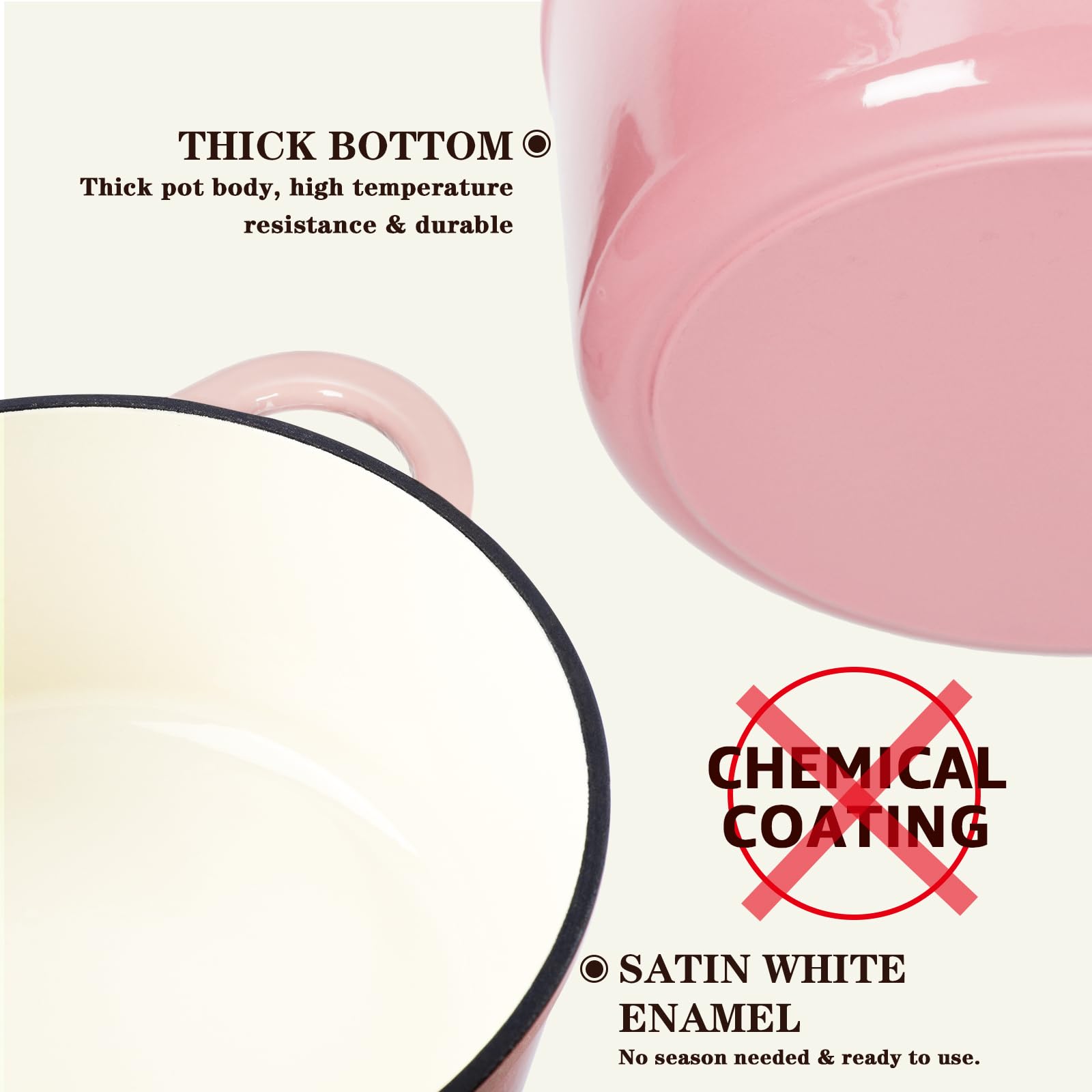 Overmont Enamel Cast Iron Dutch Oven 26cm - Oven safe with lid and cookbook - for kitchen baking roasting stewing Pink