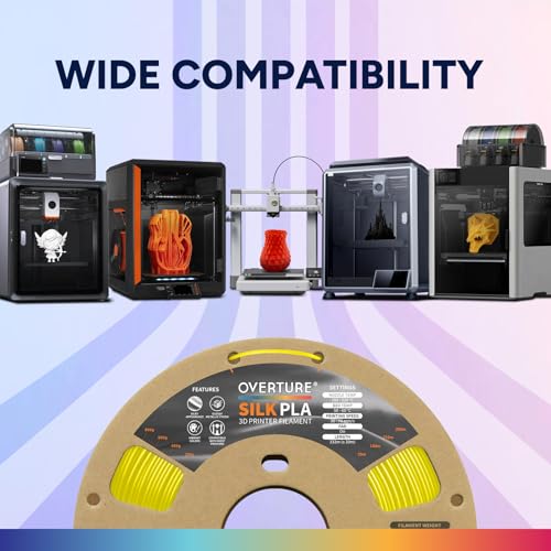 ["[Shinning Silk PLA] - This newly released OVERTURE PLA with beautiful and glossy colors gives your prints a rich and "metallic" finish, perfect for printing documents or structures with a luxurious feel","[Clog-Free and Bubble-Free] - Designed and manufactured with the Jam-Free patent to ensure a smooth and stable printing experience with these PLA refill packs. Fully dried for 24 hours before packaging and vacuum sealing with desiccants in a transparent bag","[Less Tangle and Easy to Use] - Fully mechanical winding and strict manual inspection to ensure the cord is clean and less tangle, preventing possible tearing and breaking of the cord; The spool's larger inner diameter design makes feeding smoother","[Dimensional Accuracy and Consistency] - Advanced CCD diameter measurement and self-adapting control system in manufacturing guarantee these PLA filaments with 1.75mm diameter, accuracy +/- 0.05mm; 1kg spool (2.2 lbs)","[Cost-Effective and Wide Compatibility] - With over 8 years of experience in researching and developing 3D filaments and thousands of tons of filaments being consumed every month, Overture is able to produce all kinds of filaments in large scale in premium quality, contributing to Overture's filament cost-effectively and reliably for most common 3D printers such as MK3, Ender 3, Monoprice FlashForge, and more"]