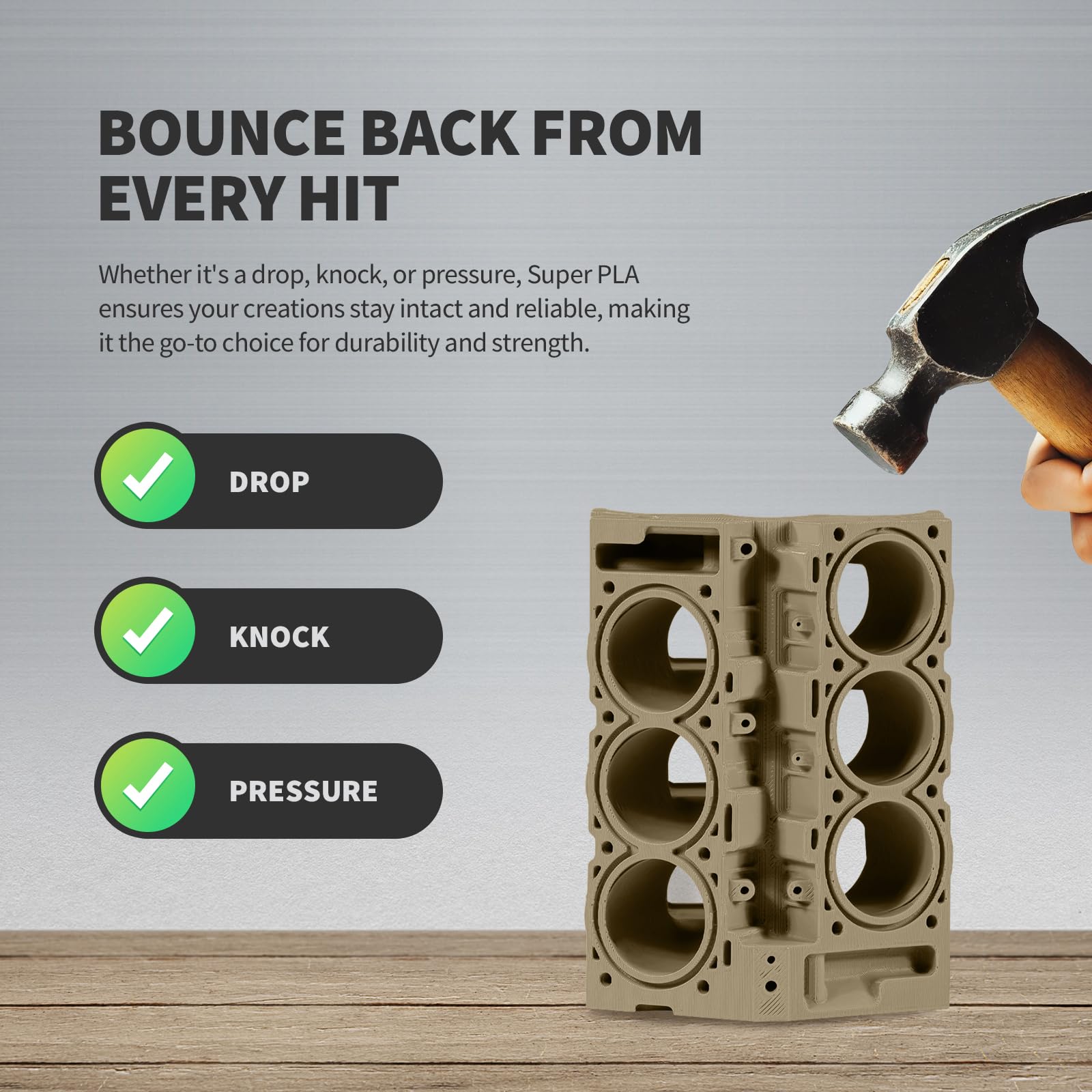 ["Improved toughness: SUPER PLA+ uses Nano-Material Technology to increase toughness, making it more resistant to impacts and durable compared to normal PLA and PLA PLUS, and less prone to breakage.","Better mechanical performance: Compared to normal PLA, SUPER PLA+ has better mechanical properties and offers a balanced ratio of strength and toughness, making it more suitable for applications that require more robust materials.","Easy to print: Although SUPER PLA+ has improved mechanical performance, it still has the advantage of being easy to print, like PLA material, even for beginners.","Excellent alternative to ABS: Since SUPER PLA+ has some advantages of PLA and ABS, it is a very good alternative to ABS that can meet certain requirements for ABS material.","Wide range of applications: The excellent performance of SUPER PLA+ allows it to be widely used in machine parts, drone accessories, remote control car anti-collision accessories, brackets, model prototypes, hooks, etc. to meet different user needs."]