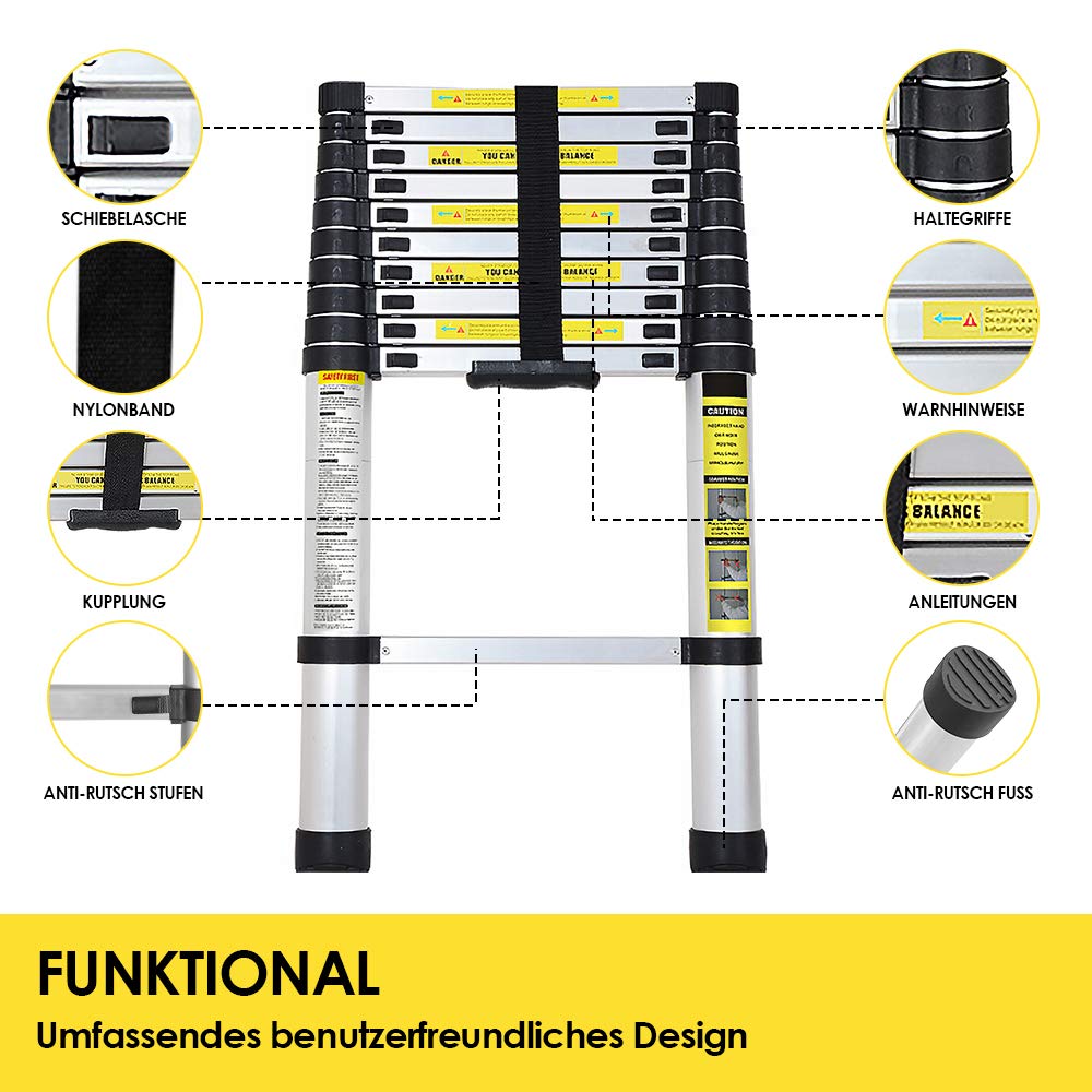 "š”ćVersatile useć: The telescopic ladder is suitable for home repairs, window cleaning, interior and exterior construction, garden and construction applications. It can also be used for home maintenance, painting, tree care, and much more. The individually adjustable height makes your life easier."]