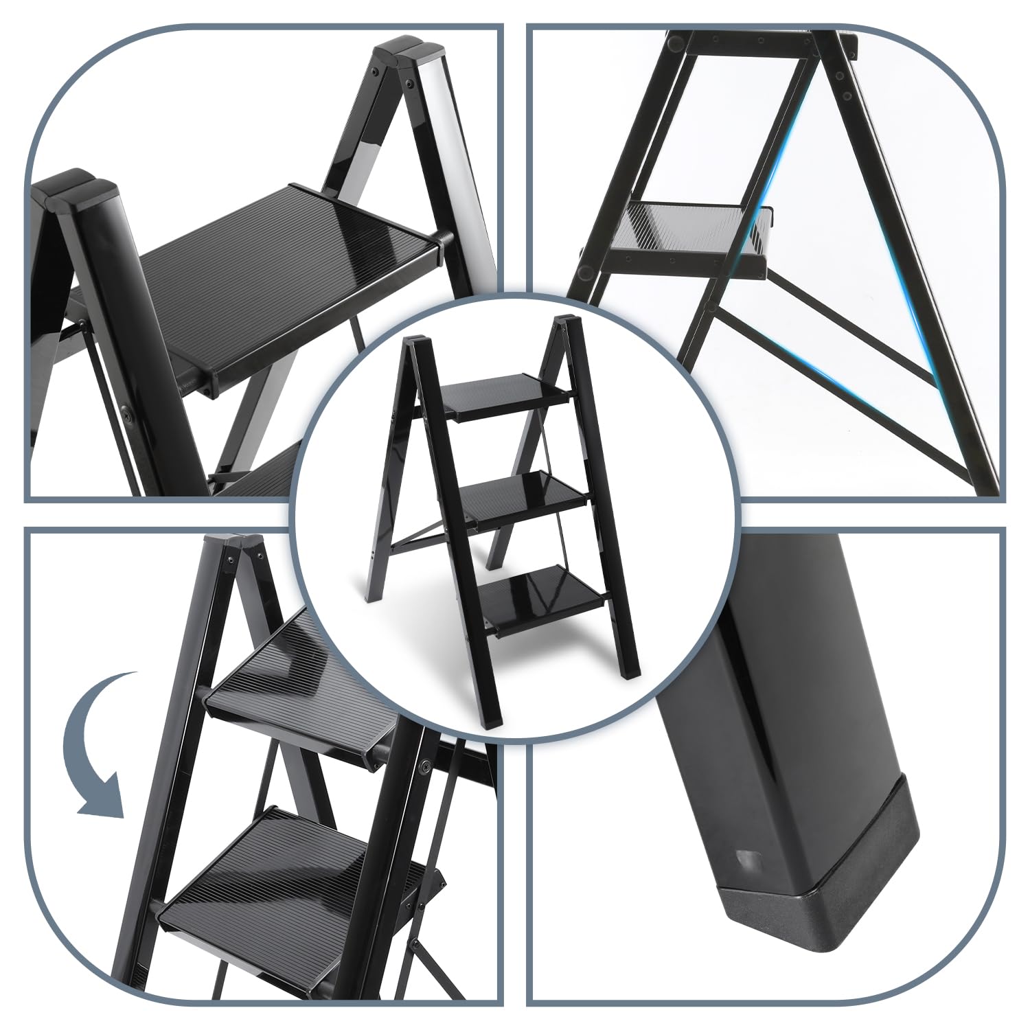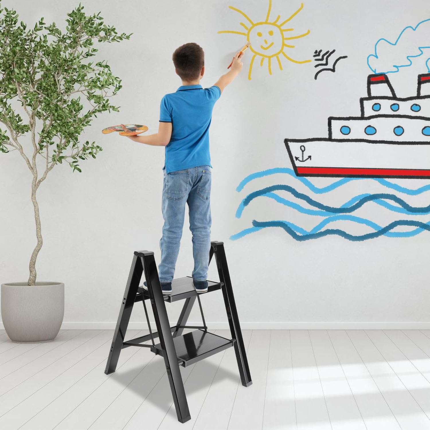 Owlstep Folding 2-Step Ladder, Lightweight Foldable Step Stool, Aluminum Footstool, Non-Slip Ladder with Folding Lock, Household Kitchen Step Ladder, Load Capacity up to 150kg, Black