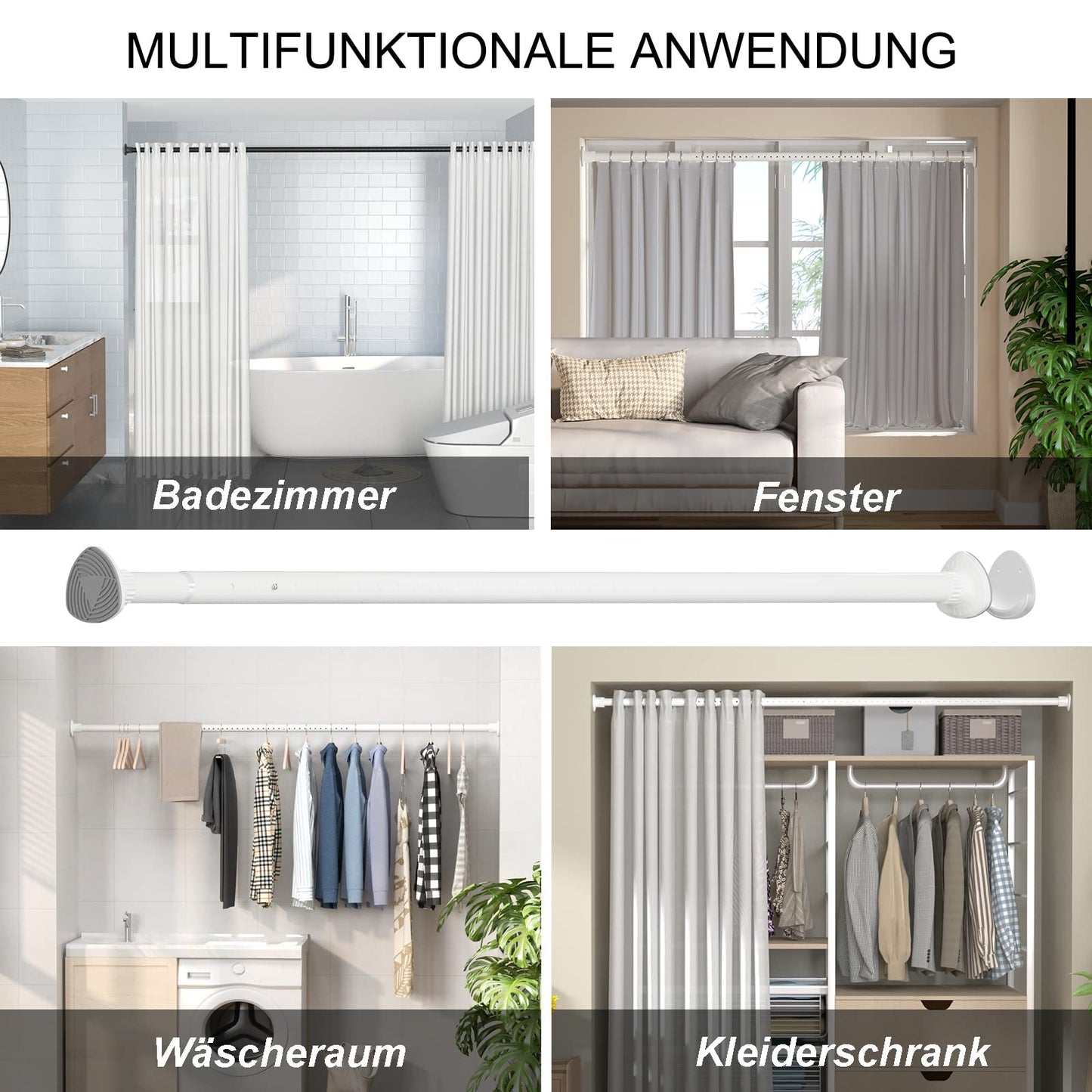 Versatile: Can be used as a shower curtain rod in the bathroom, as a curtain rod, as a drying rod, or as a rod for hanging items. Used in various scenarios, such as bathrooms, bedrooms, laundry rooms, balconies, storage rooms, and more.