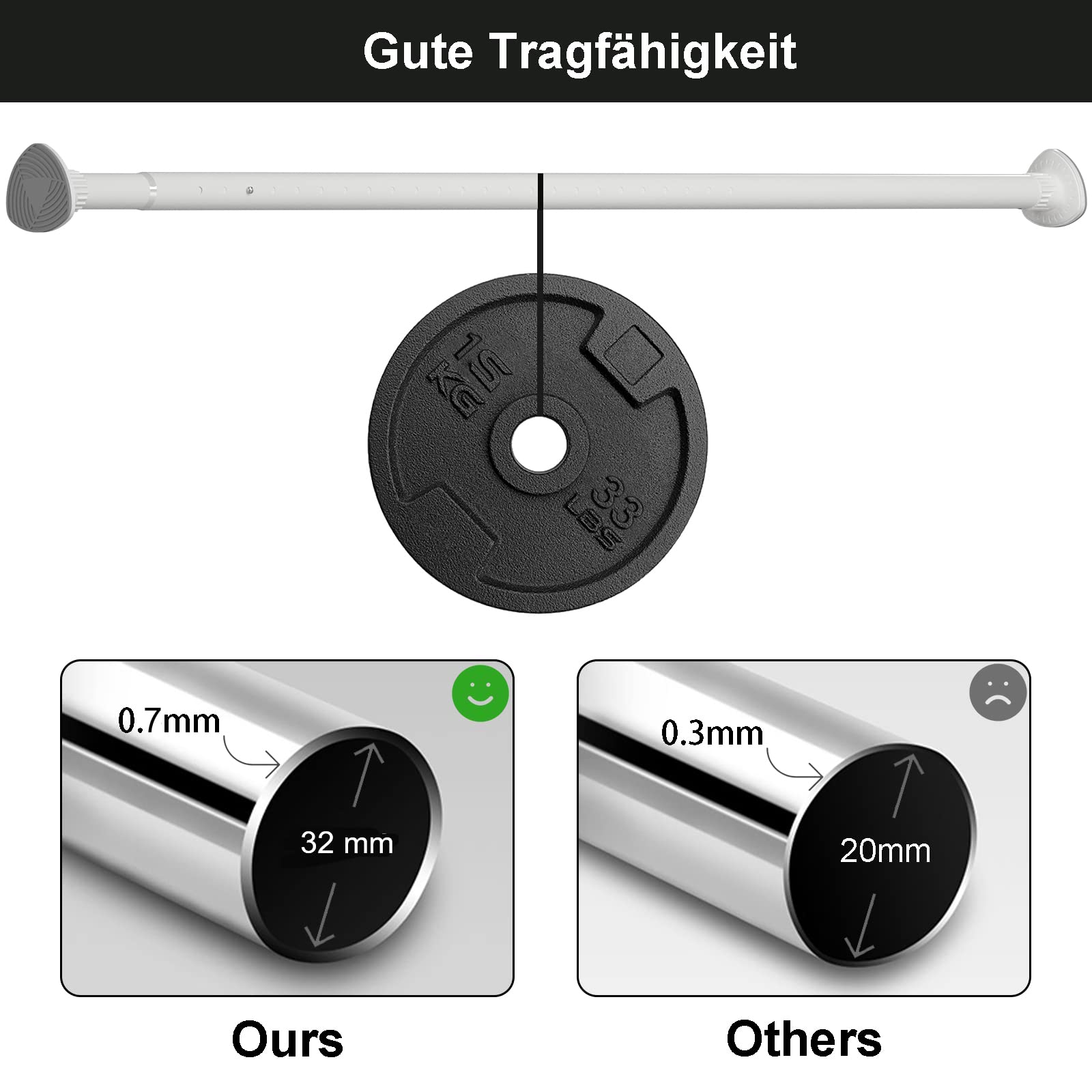 "No Rust: The shower curtain rod is not only made of thicker steel pipe, but also coated with rust protection inside and out. It has good load-bearing capacity, does not rust, and does not deform.