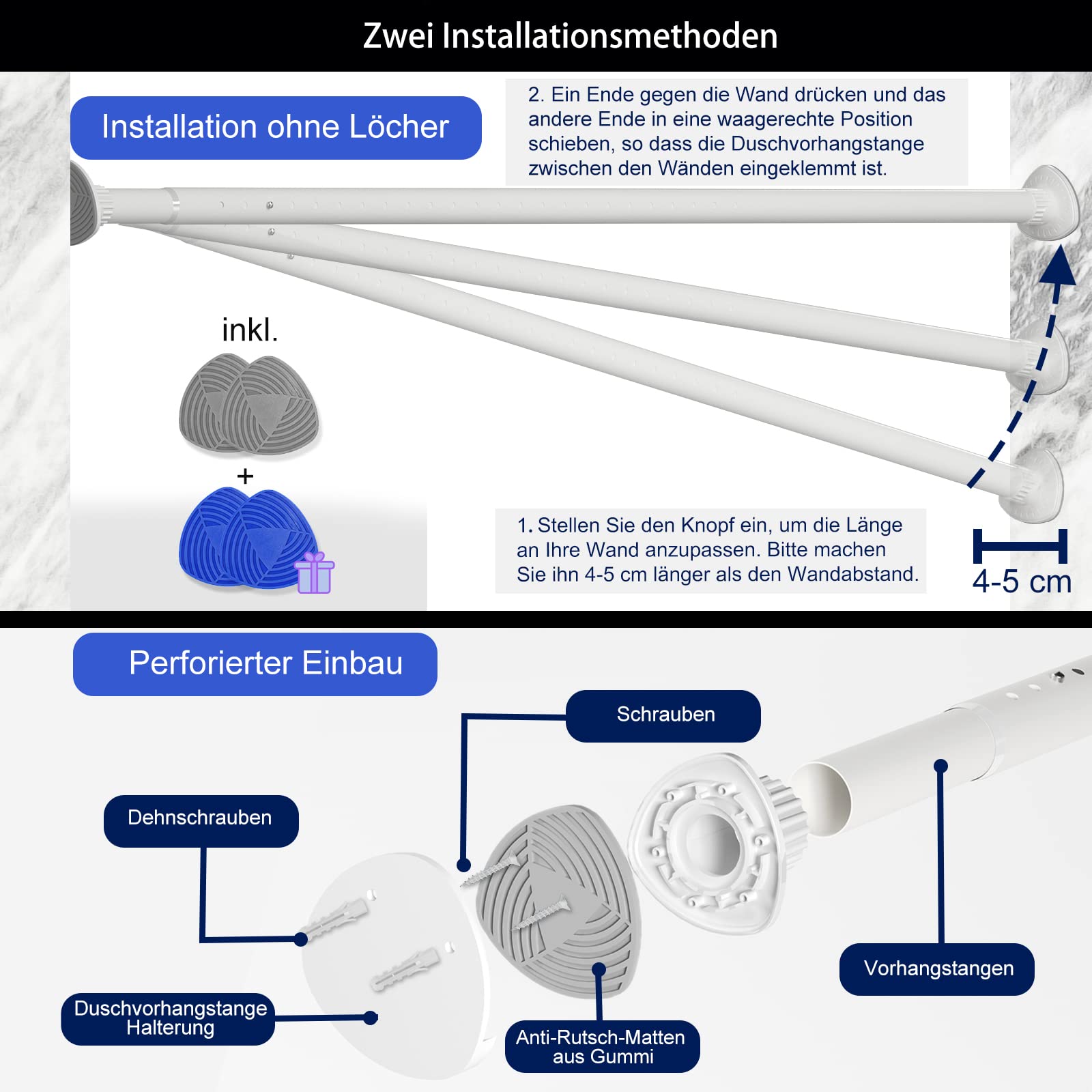 Easy to Install: No drilling required, easy to install by one person. The telescopic rod is adjustable in length and can be used on various surfaces such as tiles, marble, brick walls, glass, etc. You can also use the included brackets for shower curtain rods and screws for perforated mounting.