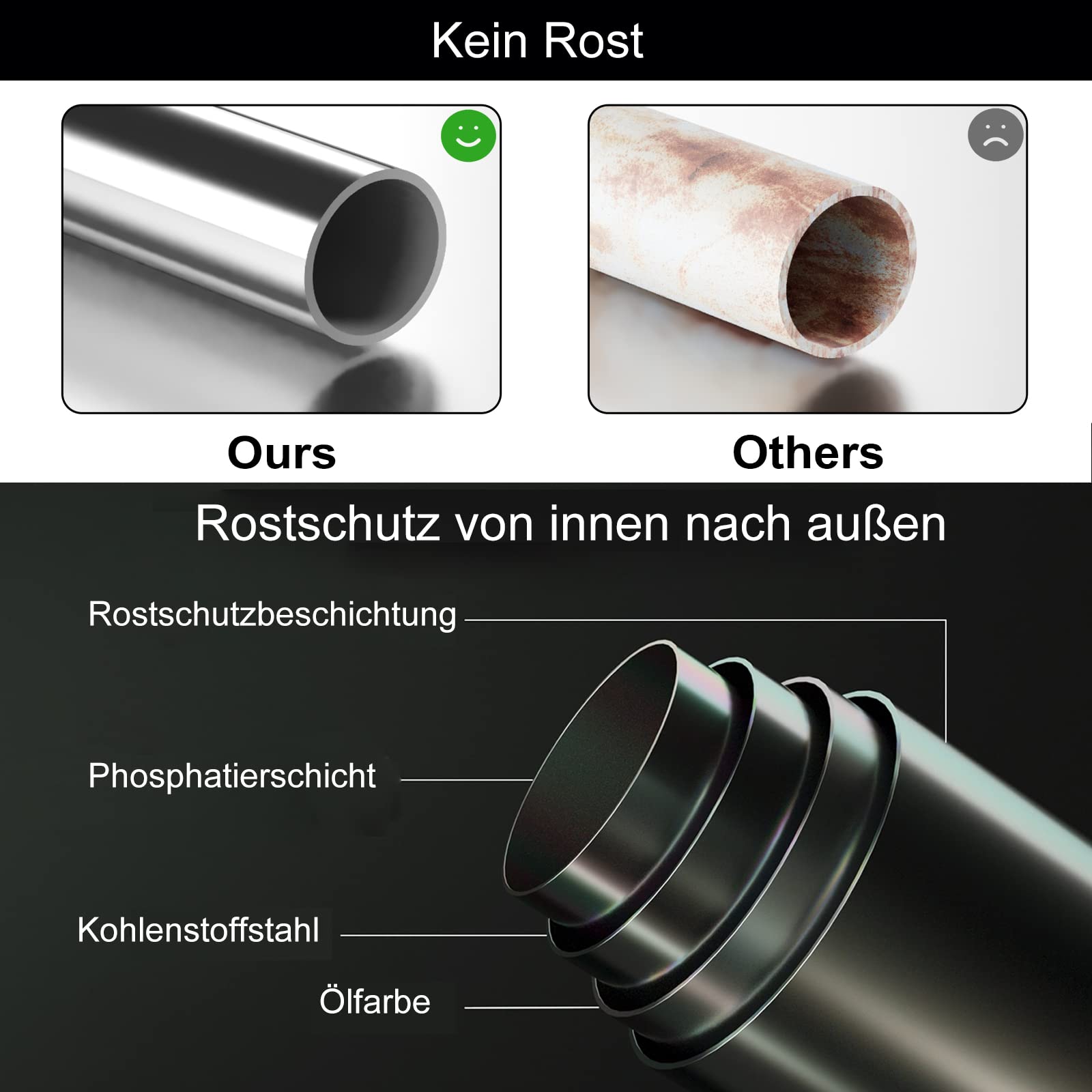 "No Rust: The shower curtain rod is not only made of thicker steel tube, but also coated inside and out with rust protection. It has good load capacity, does not rust, and does not deform."