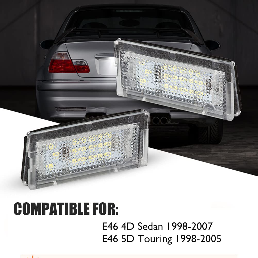 ["【Compatible Models】This LED license plate light is compatible with many BMW models, such as BMW E46 4D Sedan 1998-2007, E46 5D Touring 1998-2005. OEM part number: 51138236269, 51138236854.","【CAN-Bus Design & 100% Error Free】The OZ-LAMPE license plate lights use error-free Canbus design to avoid OBC error codes. It features 18 powerful 2835 LED beads and is characterized by low energy consumption, energy saving, and environmental protection.","【Easy Installation】This LED license plate light has an OE plug, plug and play, easy to install, no drilling required. This license plate light provides perfect Xenon white light that is sufficient to illuminate the numbers on the license plate.","【Certification】This LED license plate light is RoHS, EMARK, and CE certified, making it a very good product. At the same time, it uses waterproof material suitable for all kinds of bad weather conditions.","【Quality Customer Service】The OZ-LAMPE LED license plate light has a long lifespan of over 50000 hours. OZ-LAMPE provides 24-hour customer service and a 1-year warranty. If you have any questions, please feel free to contact us, you can enjoy the best customer service. You need to compare the size and images and the OEM (Original Equipment Manufacturer) to choose the correct license plate light for your car."]