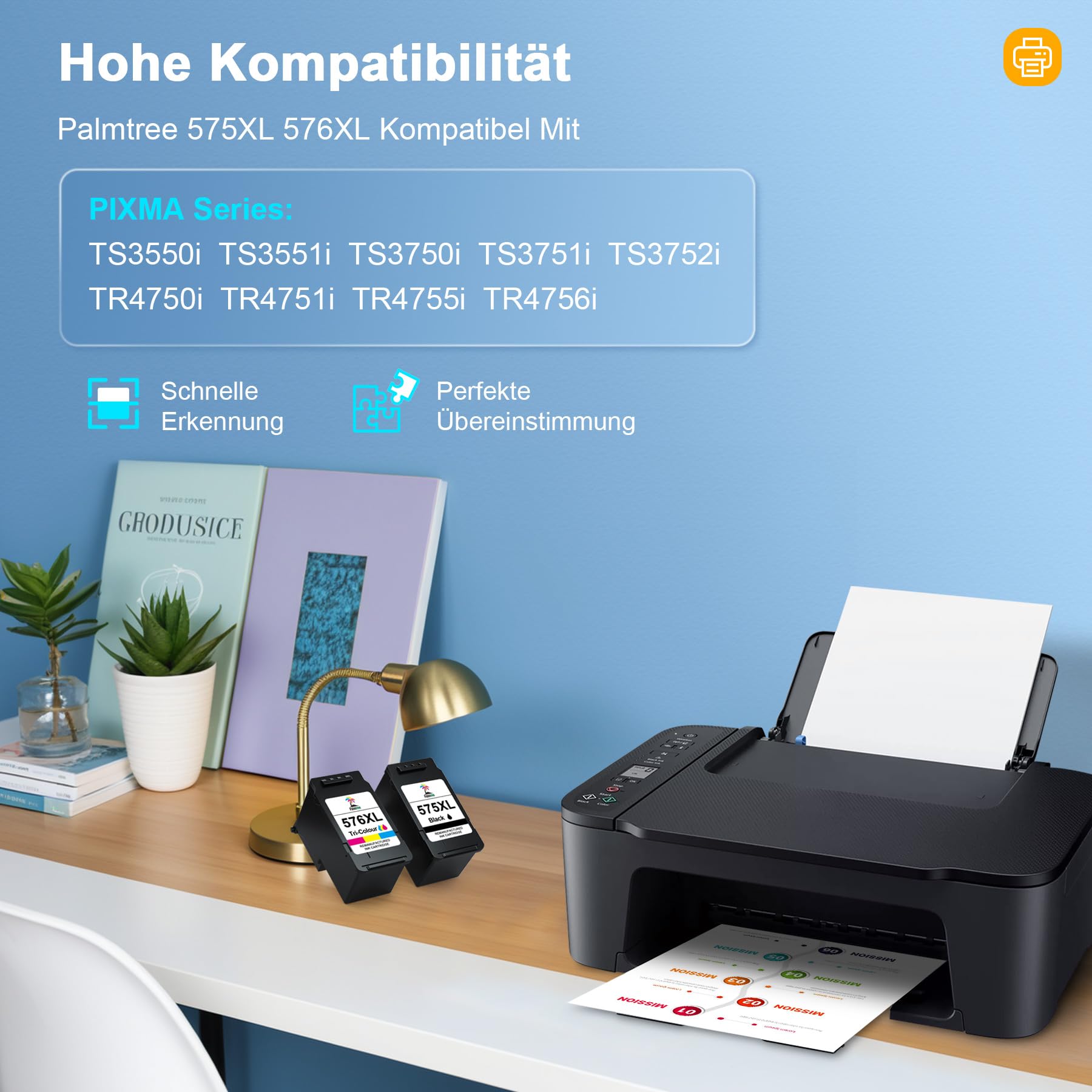 "Seamless Compatibility: The Palmtree 575XL and 576XL ink cartridges work perfectly with Canon PIXMA printers of the TS3550i, TS3551i, TS3750i, TS3751i, TS3752i, TR4750i, TR4751i, TR4755i, and TR4756i series. They ensure smooth printing from the first to the last page. Enjoy easy installation and stable performance for all your daily printing tasks.