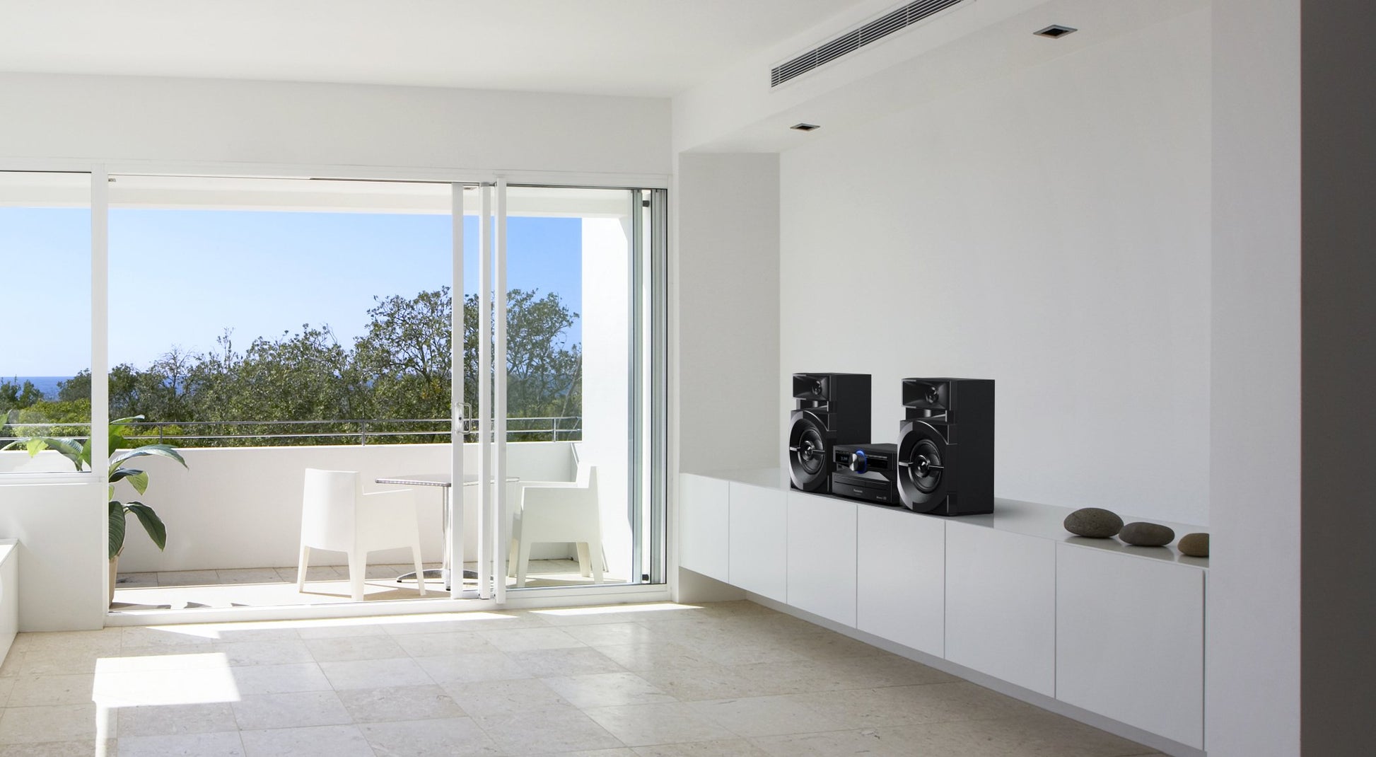 Panasonic Mini System, 300W, 2-way speakers, 13cm woofer, CD player, CD-R/RW, Bluetooth, USB, DAB/DAB+, 30 FM/15 AM RDS, AUX, audio quality, blue lighting, black DAB/DAB+ radio.