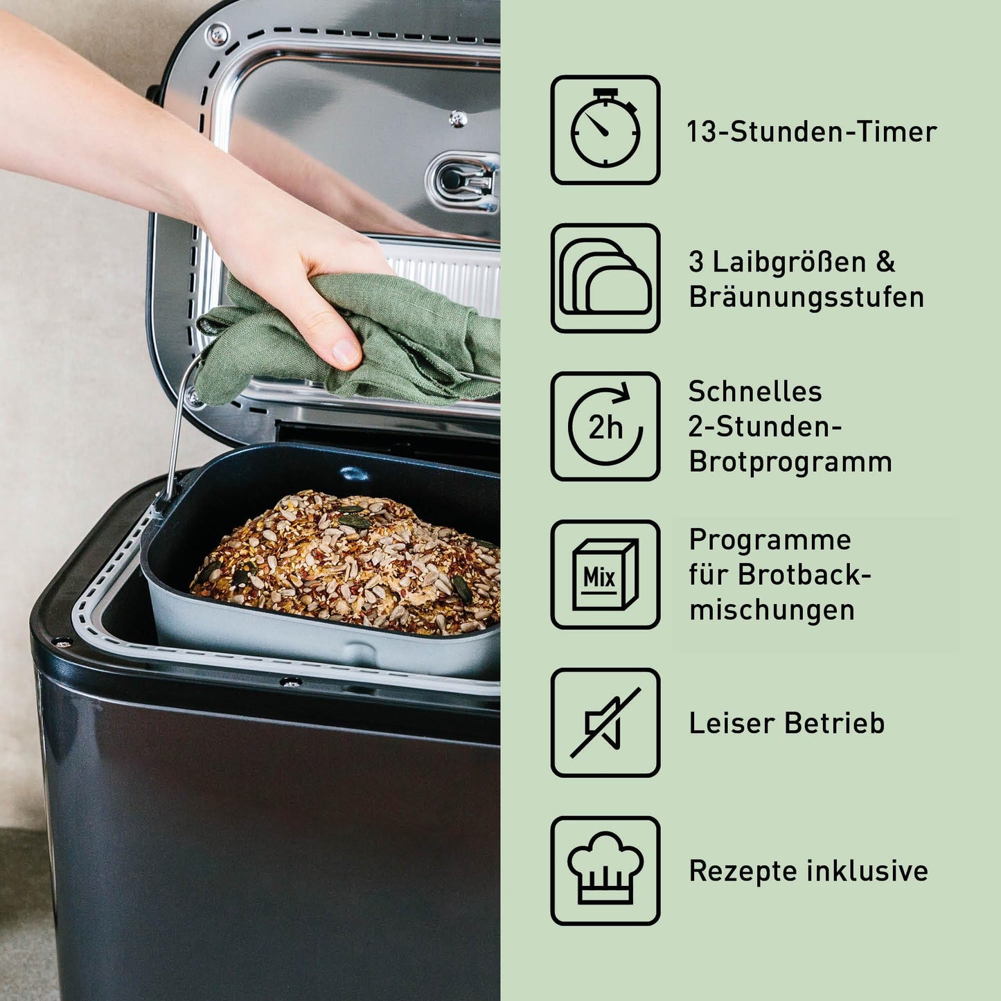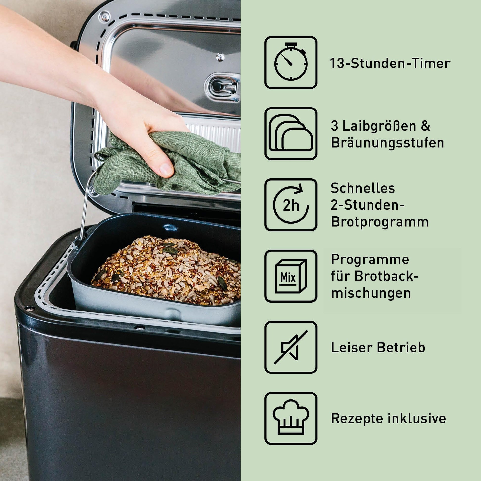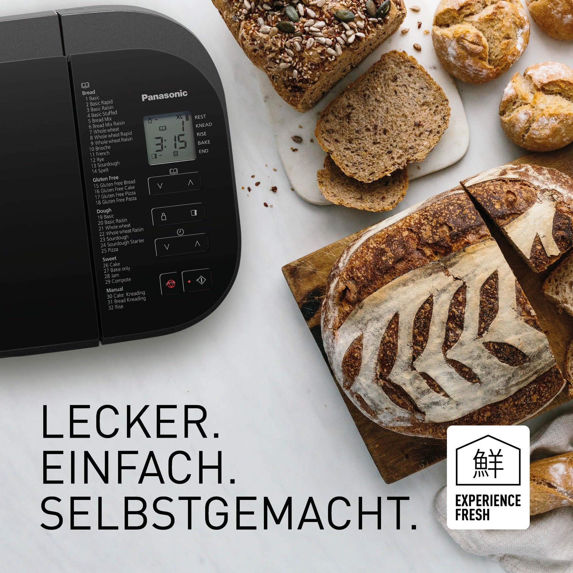 ["TWO TEMPERATURE SENSORS: This bread maker has two built-in sensors to determine the interior and exterior temperature, optimizing each program to provide you with the best possible bread quality","HANDS-FREE KNEADING: This bread maker features an innovative kneading hook with specially placed fins in the baking pan to mimic hand kneading, serving you the best bread with the ideal texture every time","FULLY AUTOMATIC: This premium bread maker has both a yeast and a raisin/nut dispenser that automatically adds ingredients at the right time, giving you delicious bread with less effort","AUTOMATIC AND MANUAL SETTINGS: This premium bread maker offers up to 32 programs, such as whole wheat, spelt, sourdough, brioche, cake, pizza, jam. Simply add water to the mix and voilà! Manual settings let you get creative","GLUTEN-FREE GOURMET BREAD: This versatile bread maker has four easy-to-use automatic programs for delicious gluten-free bread, cake, pizza dough, and pasta","TIME DELAY: Wake up every morning to the smell of freshly baked bread with the delay timer – simply add the ingredients in the evening and set the timer for the morning (up to 13 hours in advance)"]
