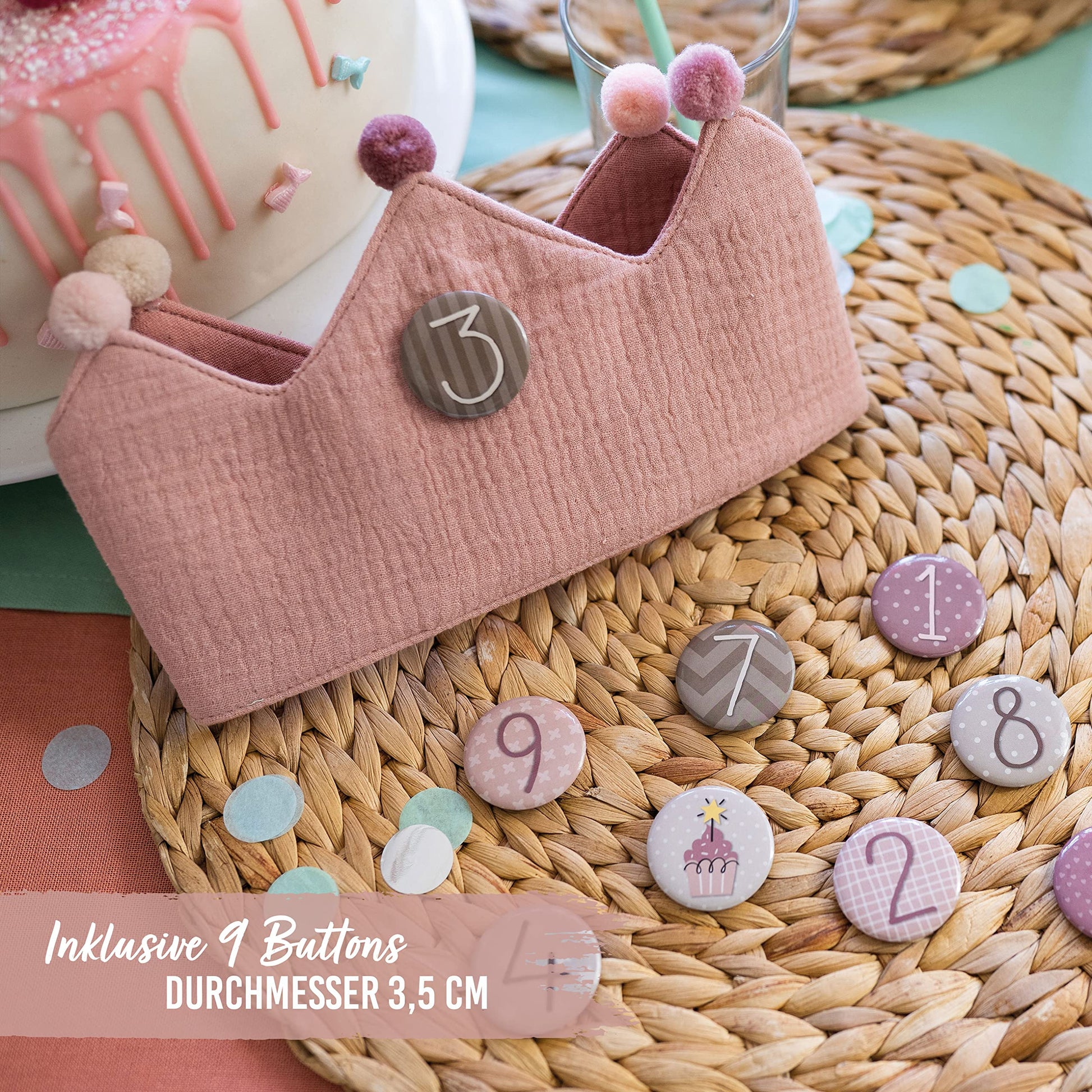 Paper Dragons Birthday Crown Muslin with Numbers - Pink - for Children's Birthday - Crown made of muslin fabric with button numbers from 1-8 | Party decoration hat for boys & girls