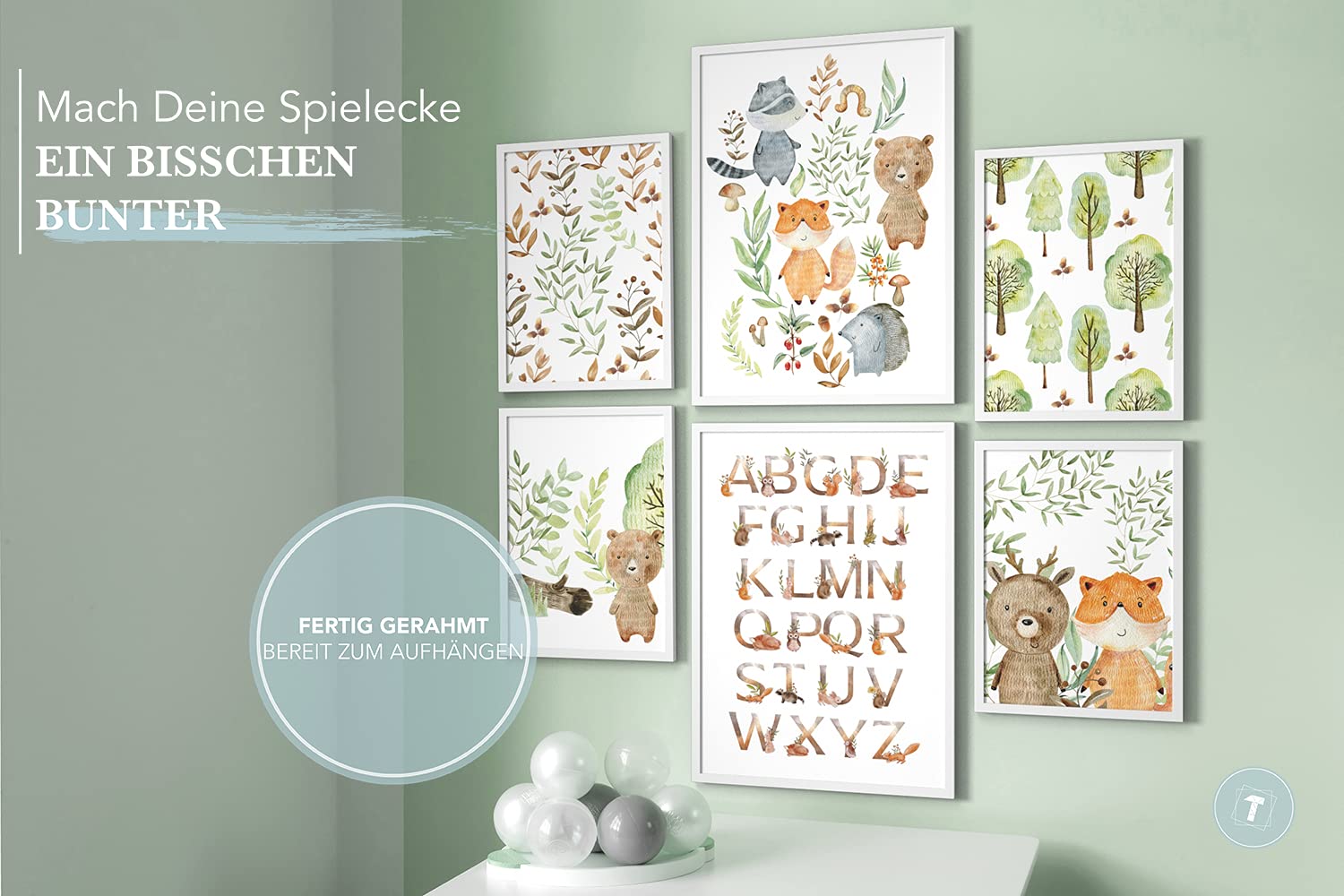 Papierschmiede® Kids Room Pictures Kids Mood Poster Set, Scout Animals, Framed pictures for children's room in white wooden frames, 2x DIN A3 and 4x DIN A4, Forest Alphabet Fox