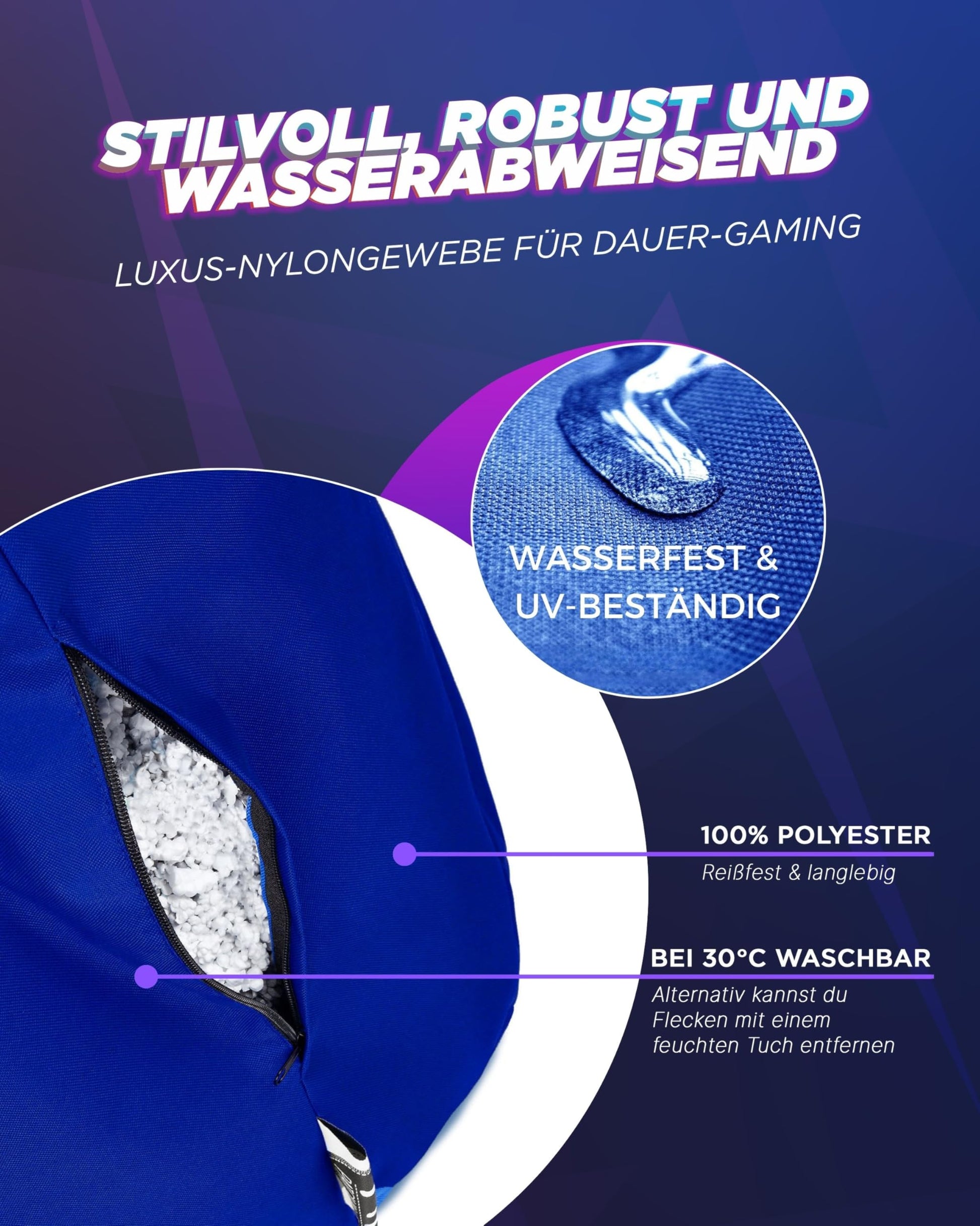 ["MEASUREMENTS: Choose between two sizes: 1. Ø75cm - Seat height: 30cm - Height: 80cm 2. Ø80cm Seat height: 30cm/ Height: 90cm","COMFORT: Thanks to the expanded polystyrene filling, the gamer chair adjusts perfectly to your body shape.","VERSATILITY: Whether you're relaxing or gaming for hours, our gamer chair is suitable for indoor & outdoor use in 25 colors.","HIGH QUALITY: Premium coated nylon fabric - Water-resistant - Easy to clean - Very durable - Double stitched with extra strong thread - Cushions come pre-filled - Made in Berlin","WEIGHT CAPACITY: Whether you're a child, teenager, or adult, our gamer chair is the perfect choice for a durable and comfortable seating option that allows for long-term use."]