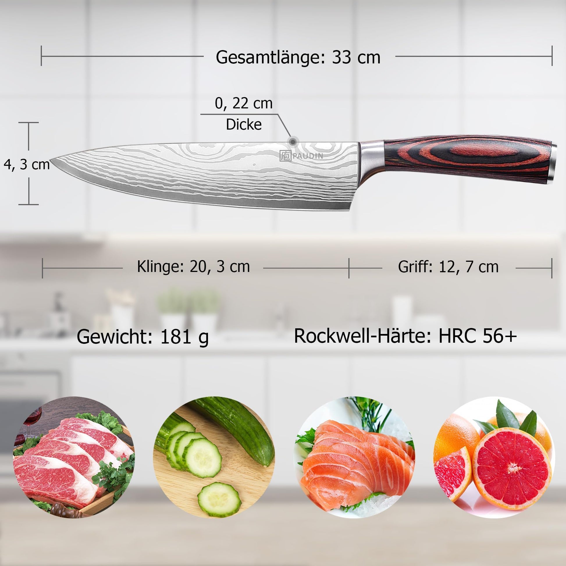 ["Ultra sharp blade: Ultra sharp blade is made of high quality German stainless steel with 16-18% chromium and 0.6-0.75% carbon. The blade is definitely rust-resistant. This gives the chef's knife a shiny and smooth surface, ideal for effortlessly cutting meat or fruits and vegetables.","High-quality materials: The professional kitchen knife with a 20 cm blade is made of stainless German steel with high carbon content. (High-quality special steel 5Cr15MoV, NOT a Damascus knife) It has a Rockwell hardness of 56-58, making it sharp, durable, and stain-resistant.","Ergonomic handle: The knife's handle is known for its handling, comfort, strength, and stability. With the ergonomically shaped and non-slip handle made of elegant wood with integrated finger guard, you always work safely and quickly. Ideal for different hand sizes.","Multifunctional chef's knife: The elegant kitchen knife for professionals and hobby chefs is ideal for peeling, cutting, and preparing fruits, vegetables, meat, fish, and herbs. Designed for various purposes and professional applications, it is truly an all-purpose knife.","Lifetime warranty: We offer you a 100% satisfaction guarantee. If you have any problems, please contact us and we will refund or replace your purchase! Lifetime warranty on material and/or manufacturing defects. Buy without risk."]