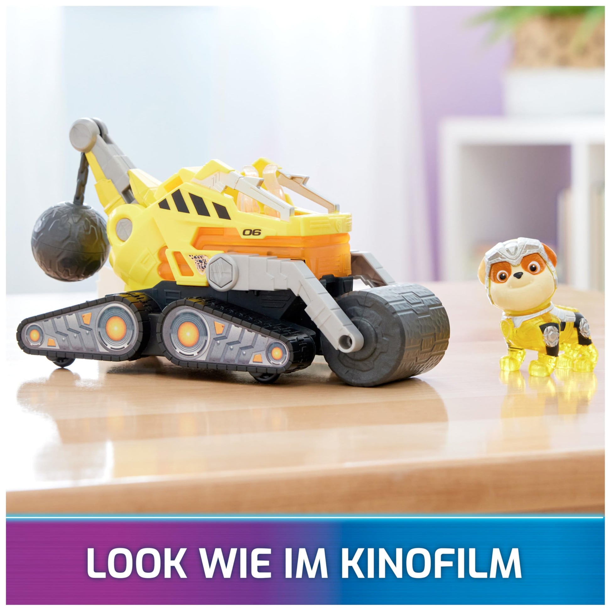 "Get the cinema adventures of PAW Patrol: The Mighty Pups Movie home. Discover the basic vehicle (approx. 17 cm long) with Rubble in the uniform from The Mighty Pups Movie (figure included, approx. 7cm tall), matching the 2nd big-screen adventure of the furry friends.
