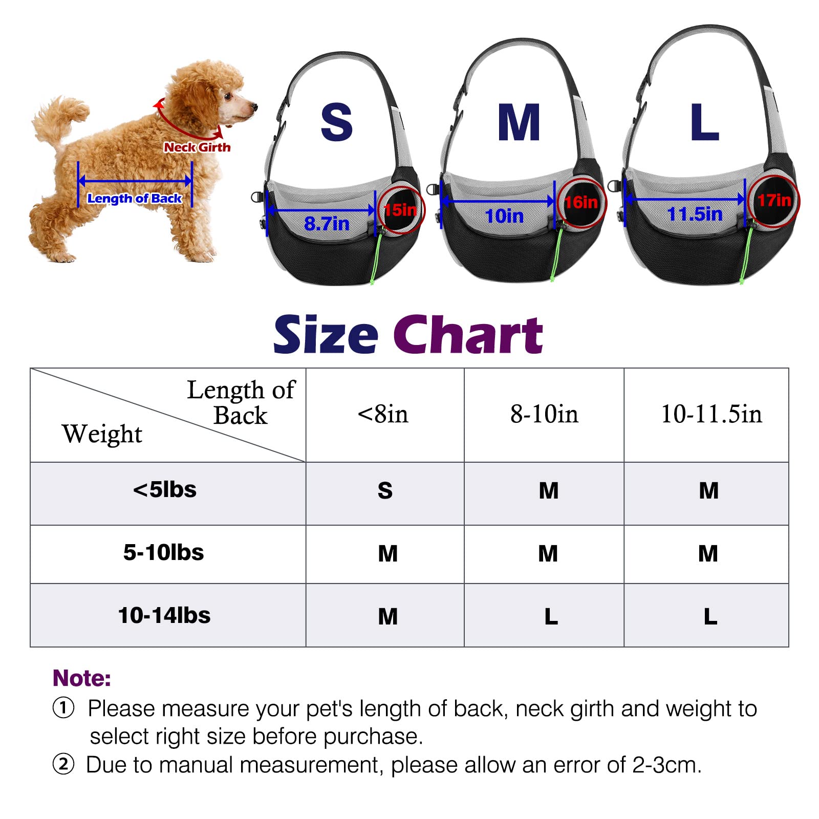 ["🐶【High-quality Materials】 - The dog carrier is made of Oxford fabric and mesh material, it has good elasticity. In addition, the mesh material is soft and breathable, allowing air circulation inside the dog bag to be maintained at all times and providing more comfort for your pet.", "🐶【Safety】 - The drawstring of the dog carrier can be adjusted in width according to the size of the pet, so it doesn't get too tight. And the built-in dog bag safety collar hook can be connected to the pet's collar to prevent the pet from jumping out.", "🐶【Adjustable Shoulder Straps】 - The dog carrier shoulder straps are ergonomically shaped and adjustable. You can adjust them to the right size so you can easily take your pet with you. And the zipper design makes it easy for pets to get in and out.", "🐶【Multiple Pockets】 - The dog bag has a zippered pocket on the back and a small pocket on the shoulder strap. In addition, there is a D-shaped buckle design for hanging foldable dog bowls, keys, and other small items. You don't have to carry extra dog carriers out the door anymore.", "🐶【Wide Application】 - The hands-free design makes it perfect for everyday use such as shopping, cycling, traveling, and hiking. Keep your dog always by your side.", "🐶【Size Guide】 - Our dog bags come in three sizes and a variety of colors. Please measure your pet's back length, neck circumference, and weight according to the size chart in the third image to choose the right size before purchasing."]