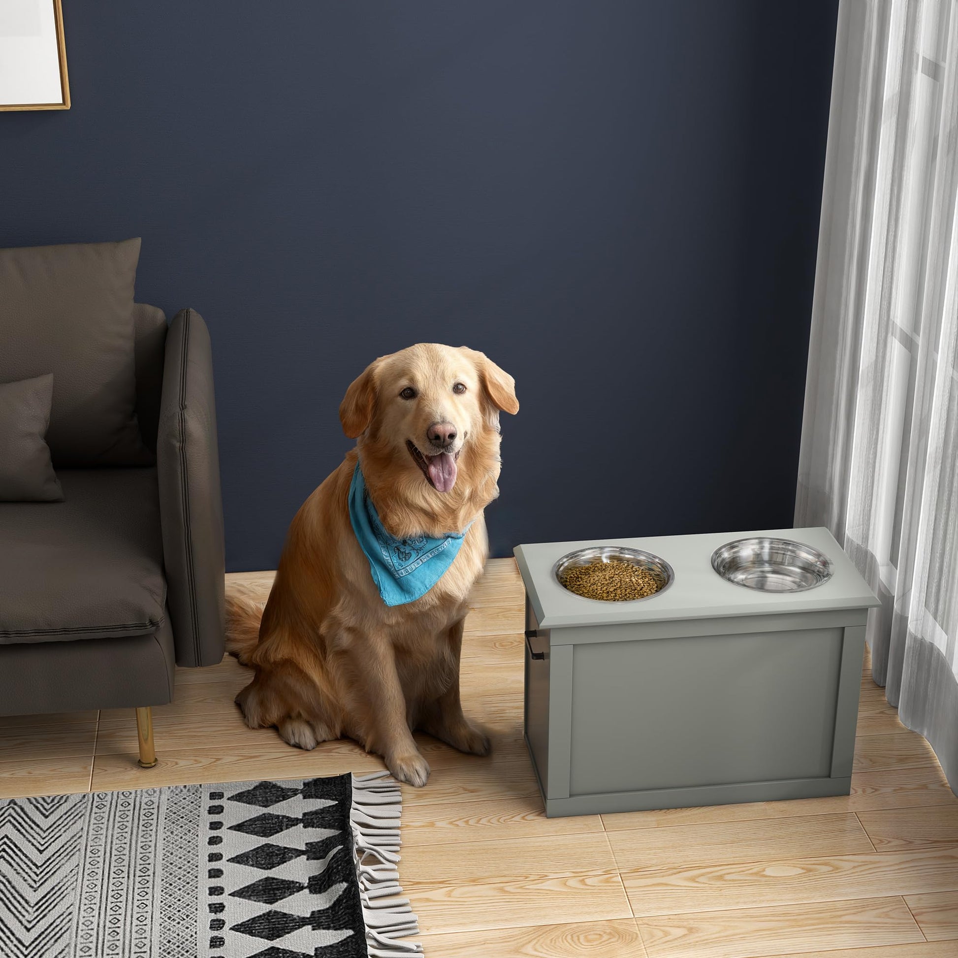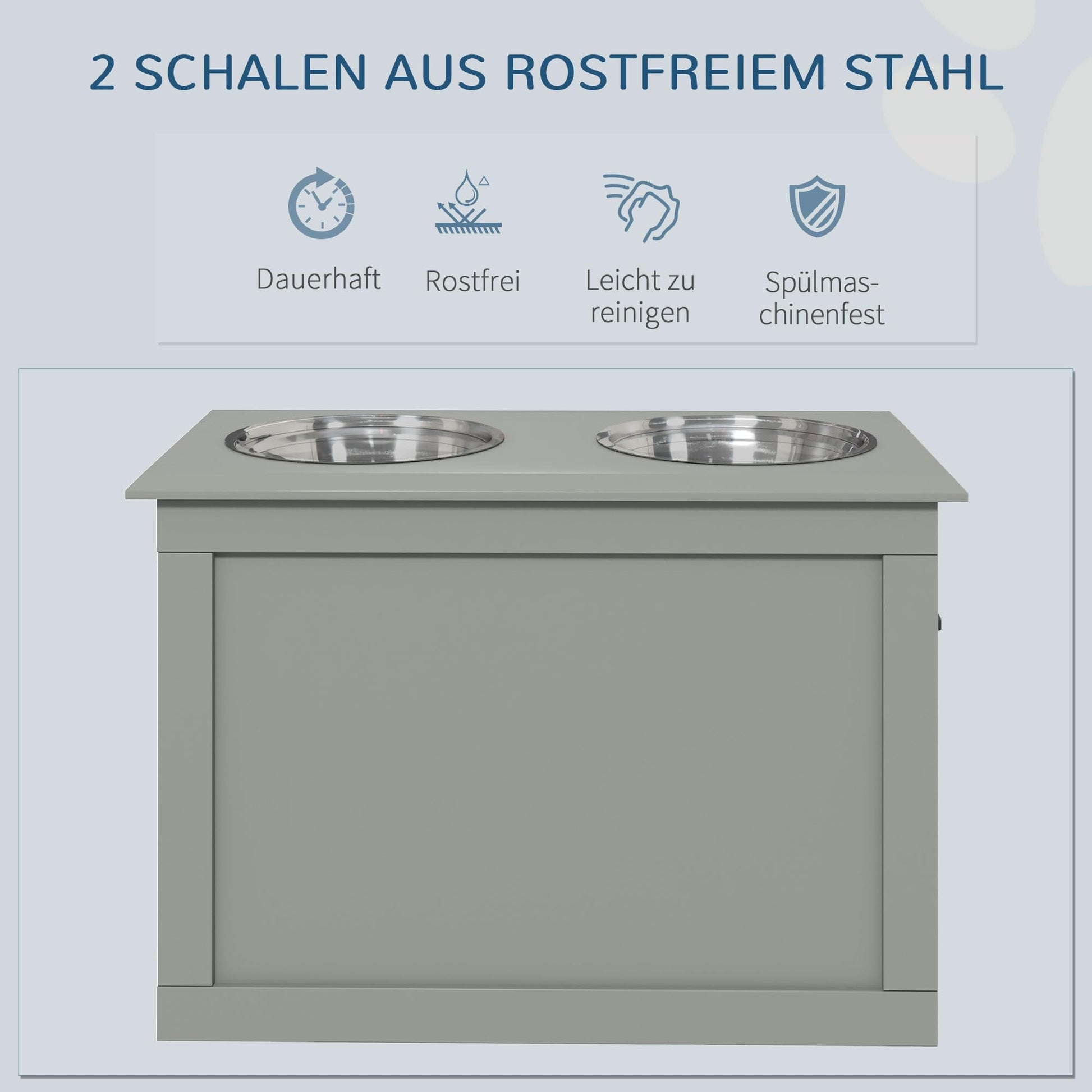 PawHut Raised Dog Bowl Feeder with Storage Compartment Water Bowl 2 x 2000ml Stainless Steel Bowls Dog Bowls Feeding Bowl Feeding Station for Dogs Cats Grey