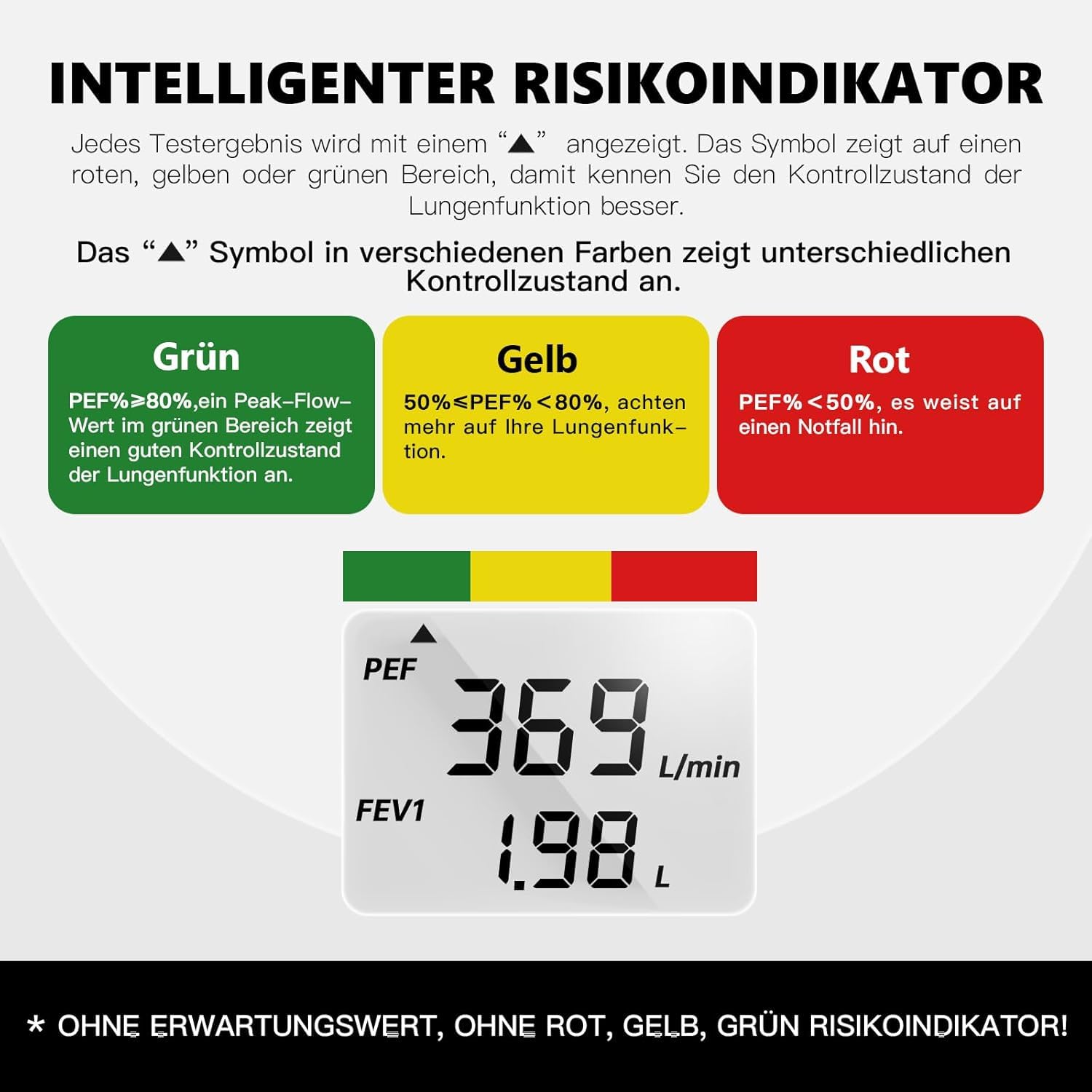 ["๐๐จ๐๐ก๐ ๐๐๐ง๐๐ฎ๐ข๐ ๐ค๐๐ข๐ญ: The electronic Spirometer uses differential pressure sensors and can measure two parameters PEF and FEV1. By measuring the airflow from the bronchi of the lungs and reflecting the degree of airway obstruction. ๐๐๐ก๐ญ๐ฎ๐ง๐ : Keep Breathing! Cannot connect with APP. You can only manually record the data in the APP!","๐๐ซ๐๐ข๐๐๐ซ๐๐ข๐ ๐๐ซ ๐๐ข๐ฌ๐ข๐ค๐จ๐๐ง๐ณ๐๐ข๐ ๐: This Peak Flow Meter comes with an LCD display, so the values are clearly visible. Set a preset value before use, and each test will display the status of your lung function with a risk symbol in red, yellow, green areas. ๐๐ข๐ง๐ฐ๐๐ข๐ฌ: Without preset value, without risk indicator!","๐๐๐ฌ๐๐ก๐๐ง๐ฌ๐ฉ๐ข๐ซ๐จ๐ฆ๐๐ญ๐๐ซ ๐ฆ๐ข๐ญ ๐ฅ๐๐ง๐ ๐๐ซ ๐๐๐๐๐ง๐ฌ๐๐๐ฎ๐๐ซ: This test device is powered by 2 AAA batteries and allows daily use for up to one year. Thanks to its compact design, it can be conveniently carried in your pocket and monitor lung function anytime, anywhere. Easy to clean and disinfect.","๐๐๐ฉ๐ข๐๐ซ ๐๐๐ ๐๐๐ฎ๐๐ก ๐